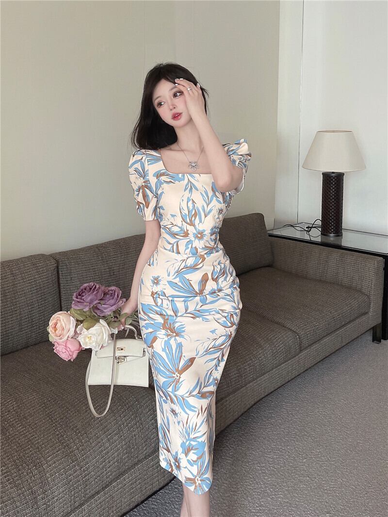 ドレスエンド気質レディ女神ファンハイエンドレトロプリントフレンチスクエアネックパフスリーブミドル丈スカート micat29031712361
