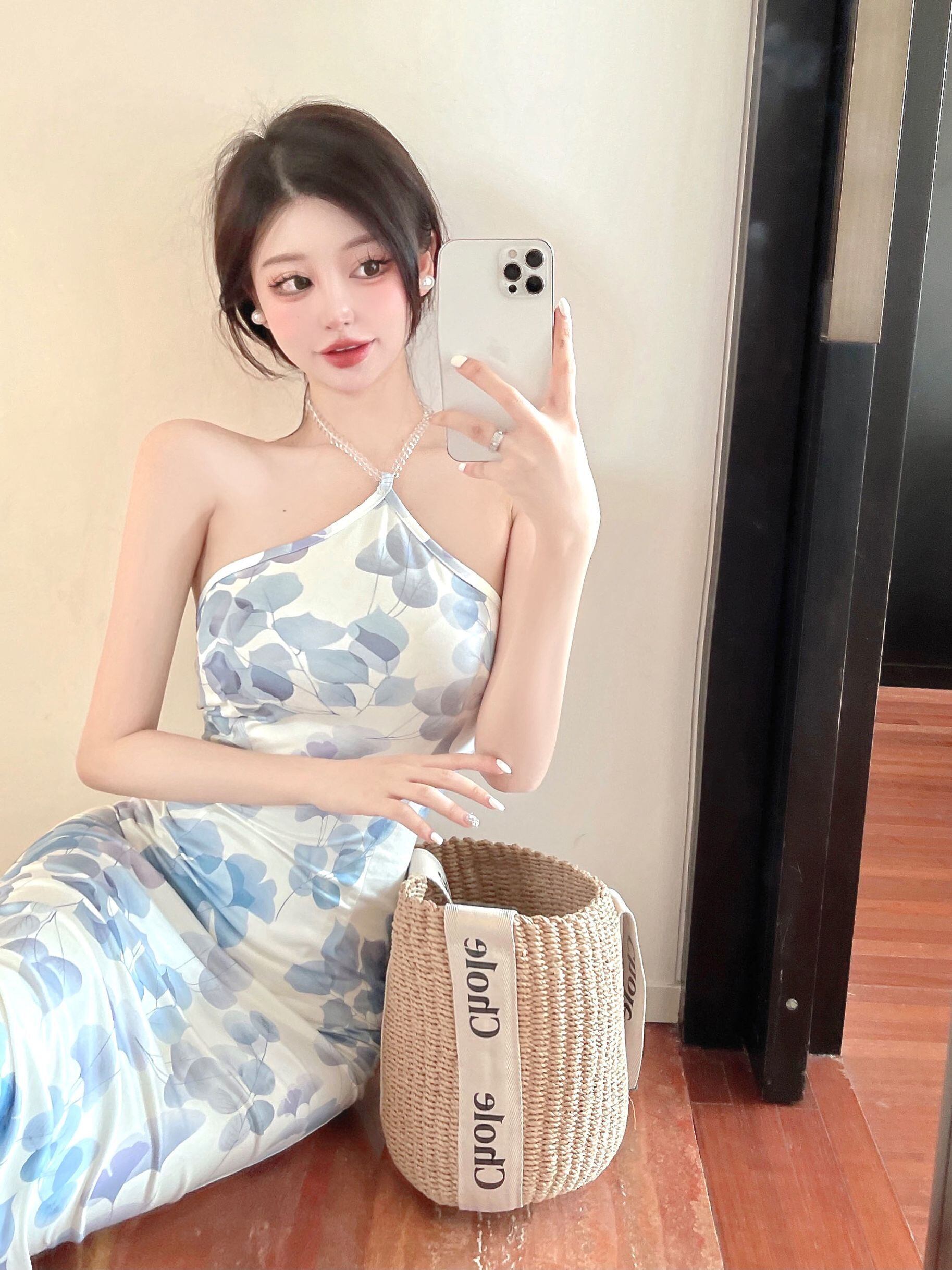 ロングスカートは細くて背が高い夏の女性のビーチでの休暇穏やかな風レトロなプリントのセクシーなオフショルダーのホルターネックのドレス micat16608544228