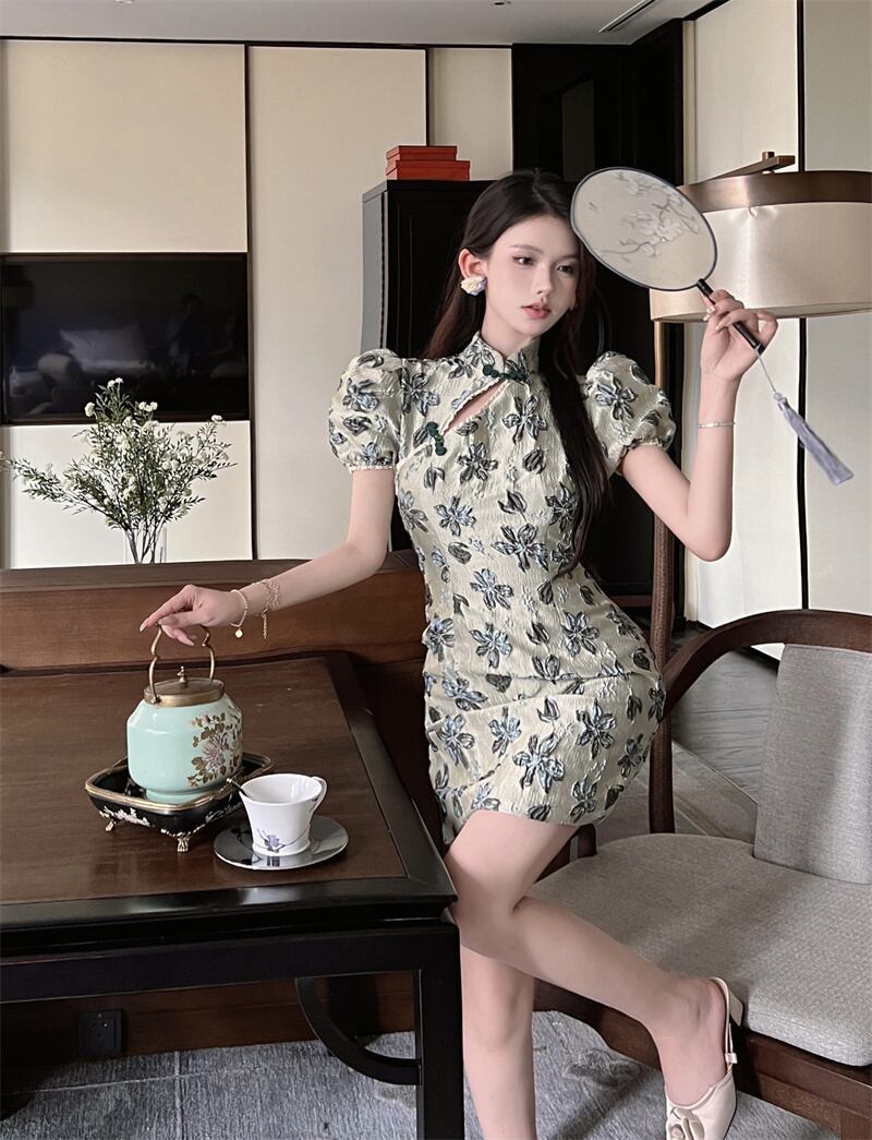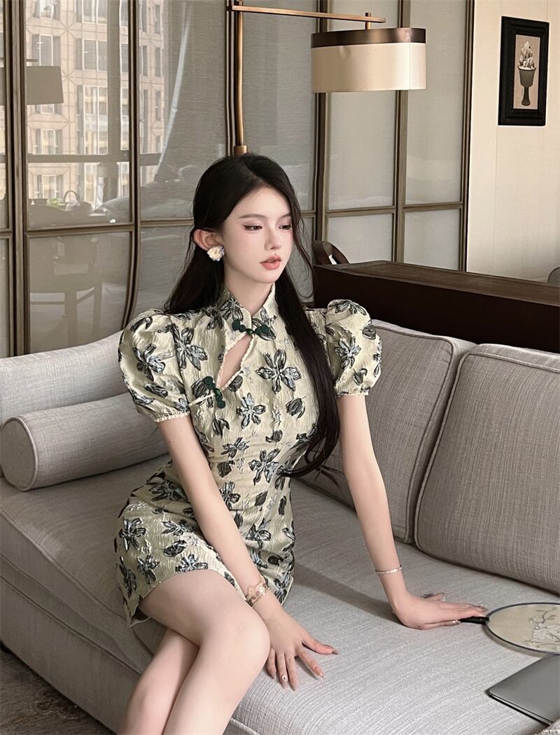 小さな新鮮なチャイナ ドレス若い 2022年新しい夏改良グリーン フレンチ パフ スリーブ ドレス micat69643540069