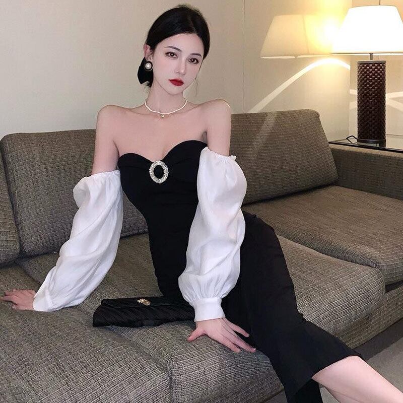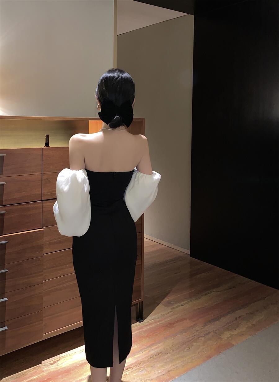 ヘップバーン スタイル イブニング ドレス スカート フェミニン気質ライト ラグジュアリー ニッチ ハイエンド フレンチ セクシー ブラック ランタン スリーブ チューブ トップ ドレス micat43787010345