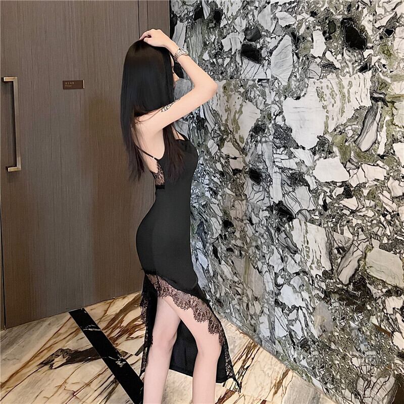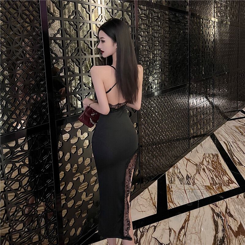 黒のイブニングドレスナイトショップの女性の宴会の気質のセクシーな背中の開いたレースのレースのハイスリットサスペンダードレス micat89612648596