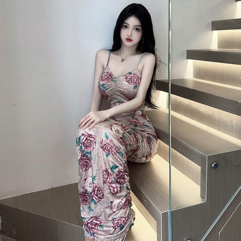 イブニングドレス掃討ロングスカート女性宴会気質レトロな印刷セクシーな V ネックスリムスリムサスペンダードレス micat95229563092