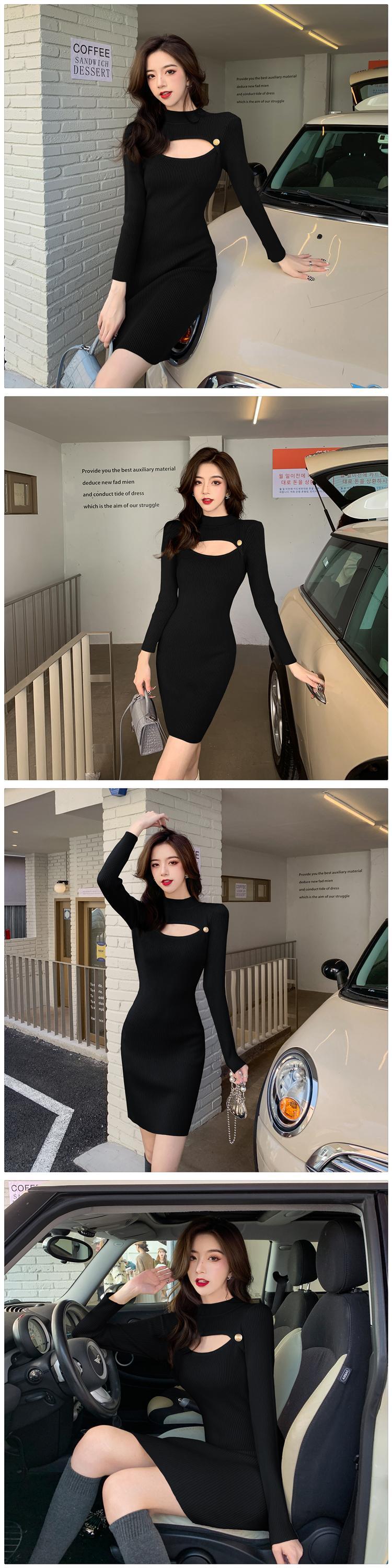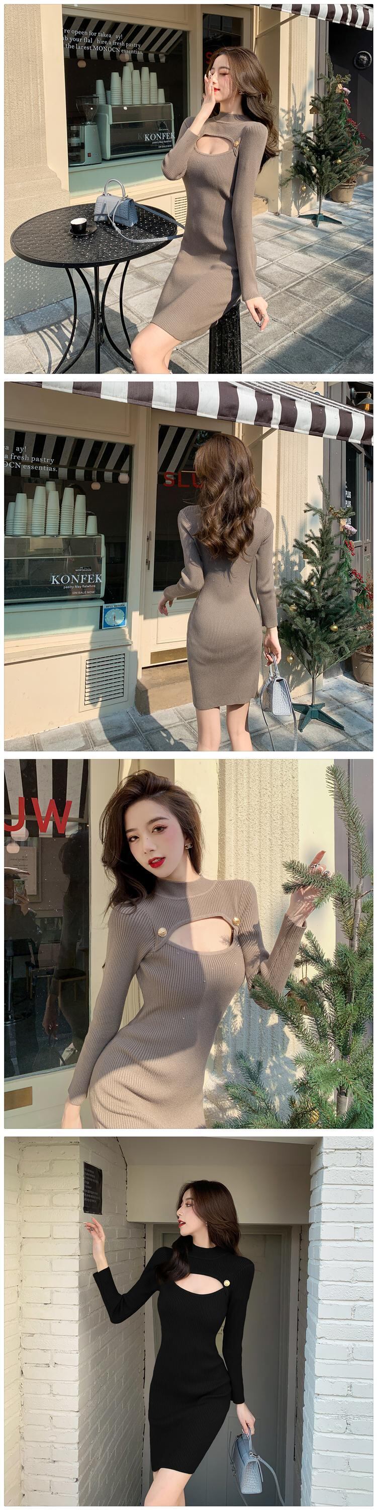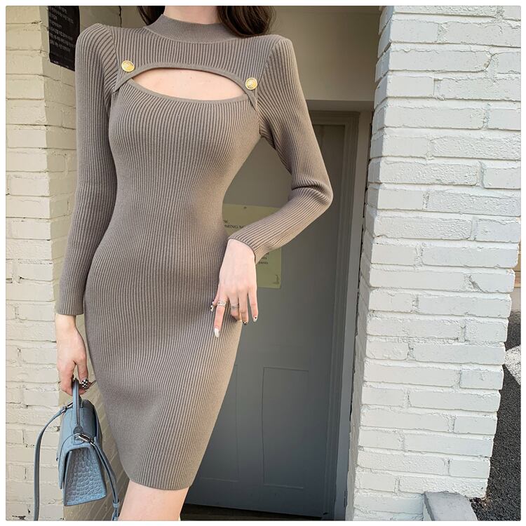 秋の今年の人気の婦人服の新しいデザインの感覚のニッチなセクシーな中空の長袖のニットの底入れのドレス micat14574150993
