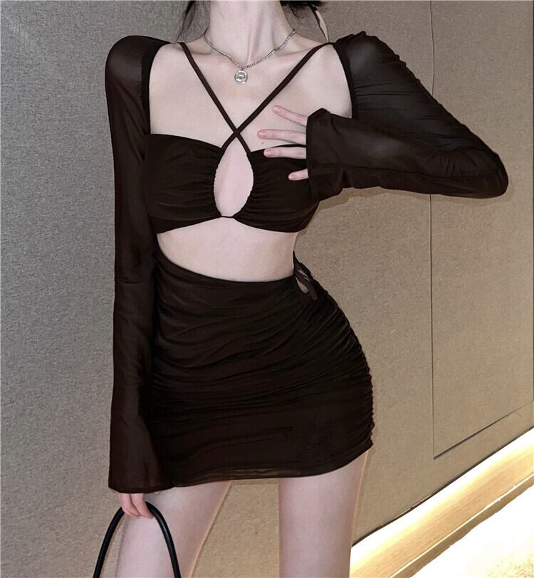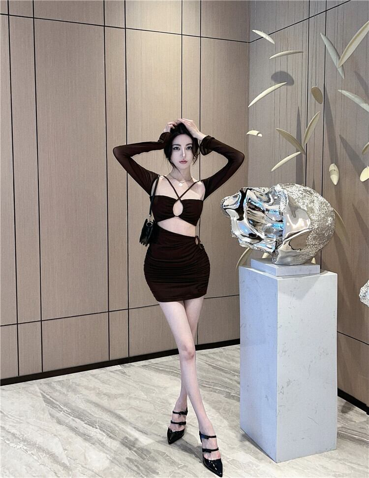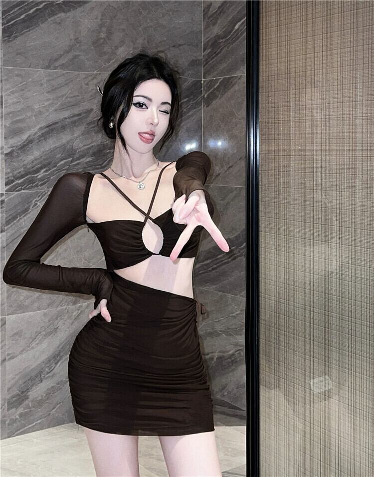 ナイトクラブの女性のナイト バー ダンス セクシーな中空ローカット ディープ V ネック メッシュ ステッチ長袖ホルター ドレス micat99128752966