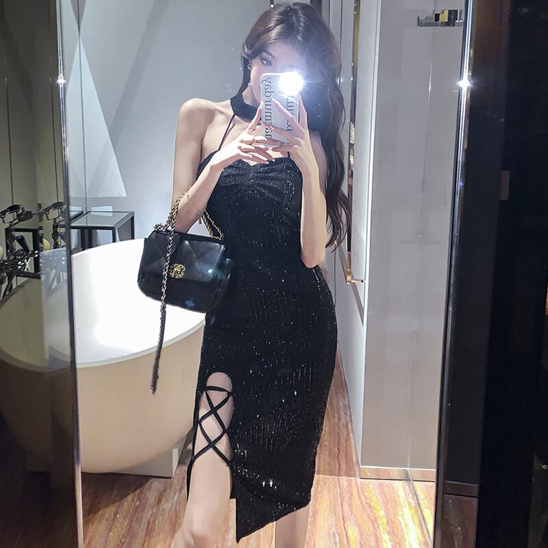 セクシーなイブニングドレスの女性の夏のハイエンドの質感の黒のスパンコールがぶら下がっているネックスリングスリムな気質のハイエンドの宴会の主催者 micat9453051721