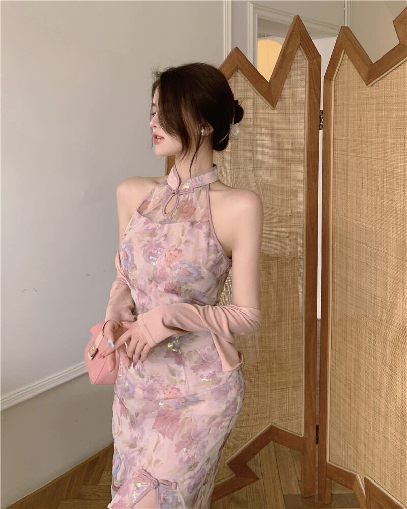 改善されたチャイナ ドレス若い夏の気質ハイエンド レトロ セクシーなオフショルダー ミッドレングス ホルター ドレス micat69169775770