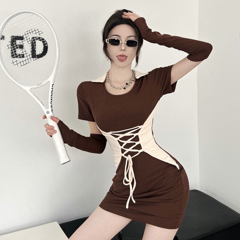 初秋の今年の人気の女性の新しいクロス ストラップ フェイク ツー ピース セクシー ヒップ ドレス スリーブ付き micat47873921637