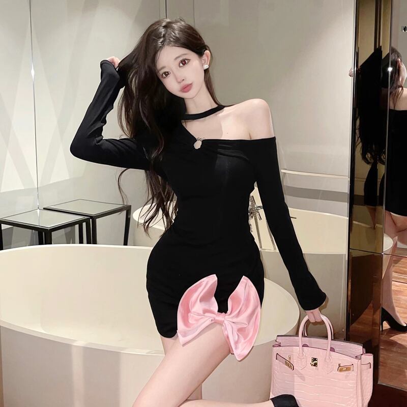 生放送服女性アンカーポジェニックハイエンド純粋な欲望スタイルセクシー斜め襟ワンショルダー長袖ホルターネックオフショルダードレス micat96475264457