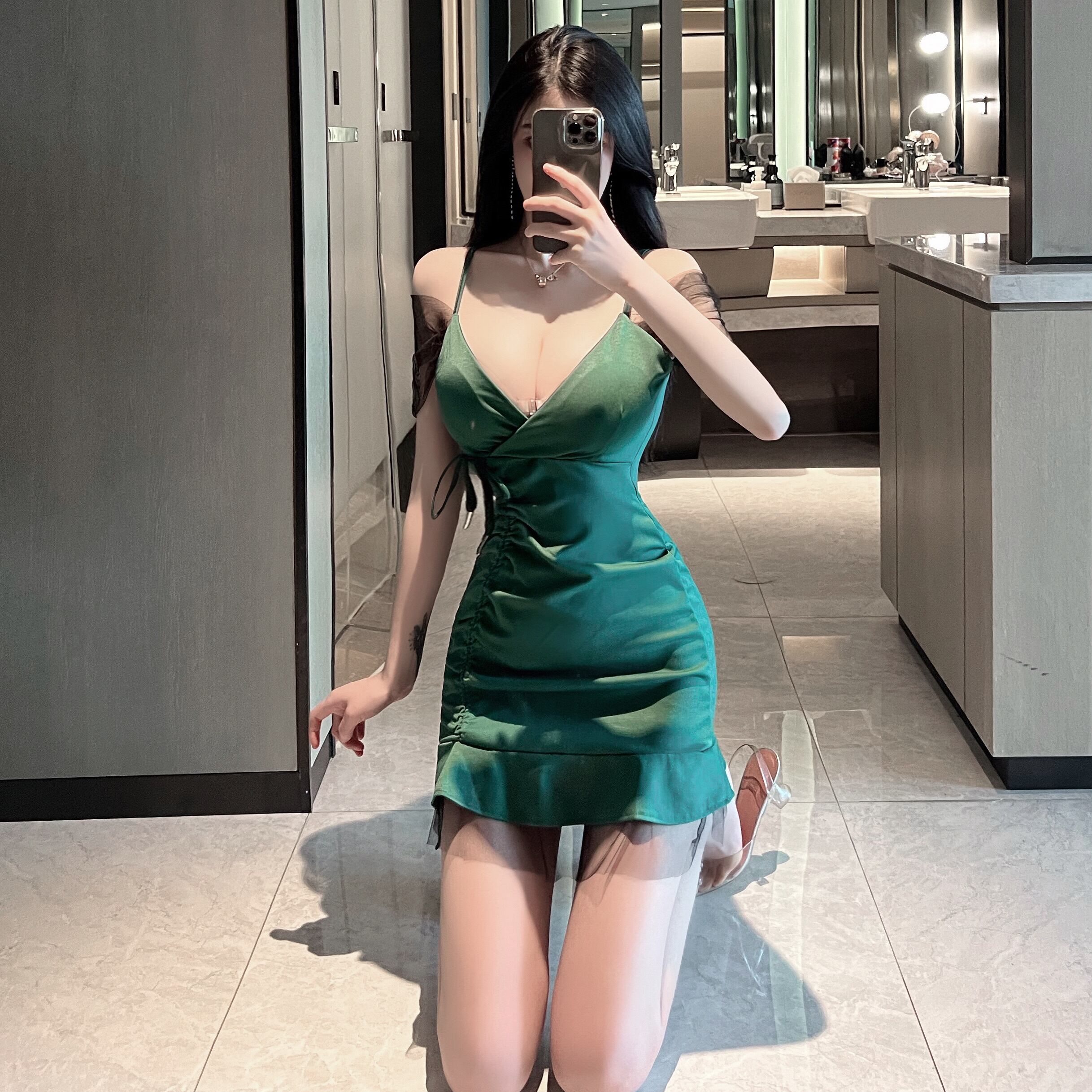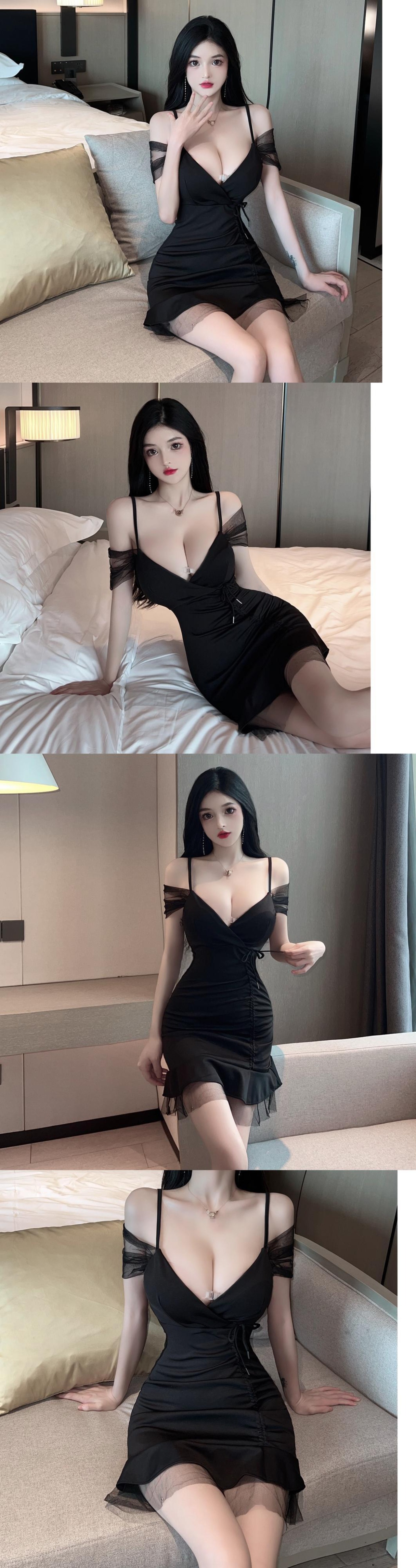 ナイトクラブの女性の夜の作業服セクシーなローカット深い V ネック メッシュ ステッチ フィッシュテール ショート スカート サスペンダー ドレス micat21880359549