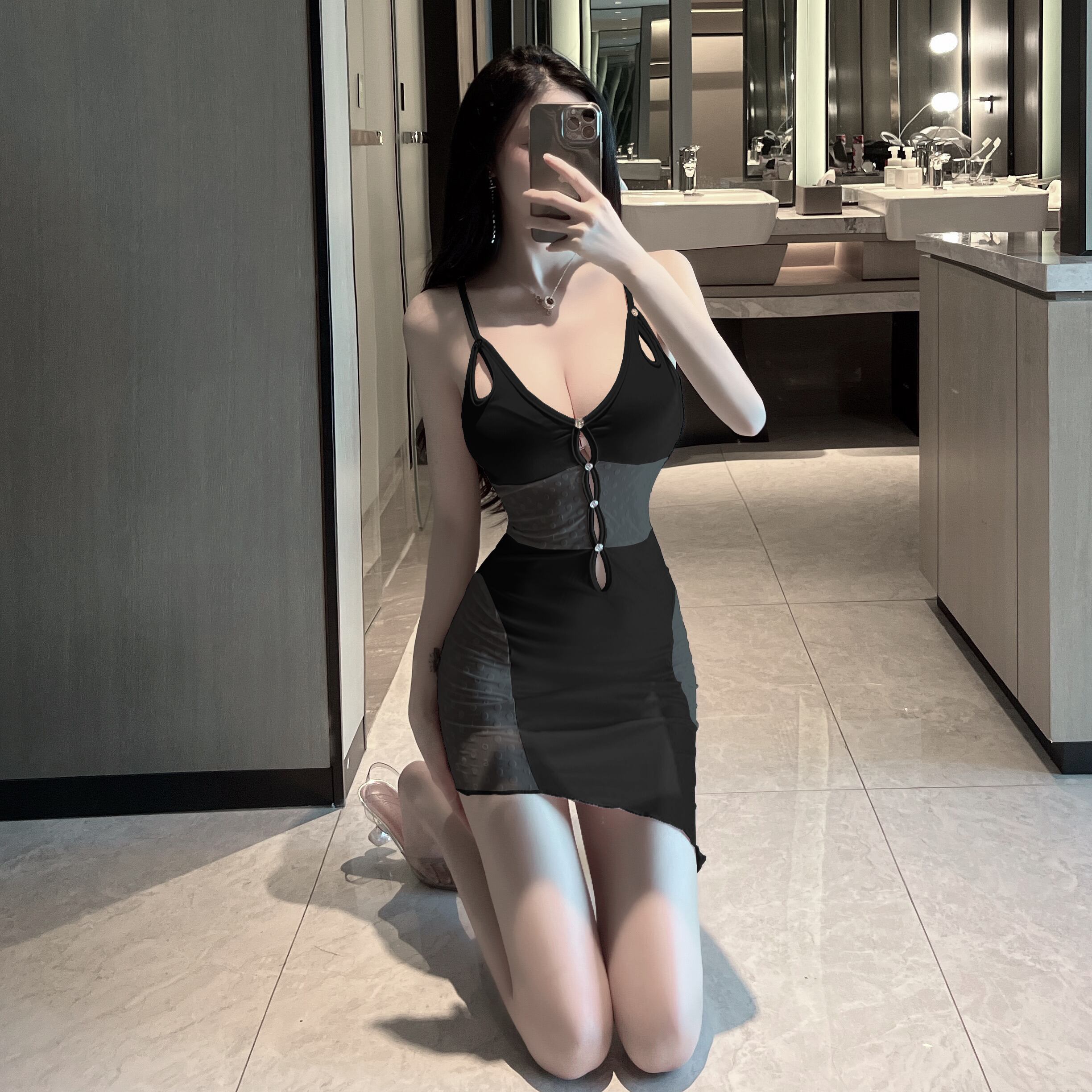 ナイトクラブ レディース 夜勤服 くり抜き セクシー ローカット 深いVネック メッシュ ステッチ イレギュラー サスペンダー ドレス micat31105015455