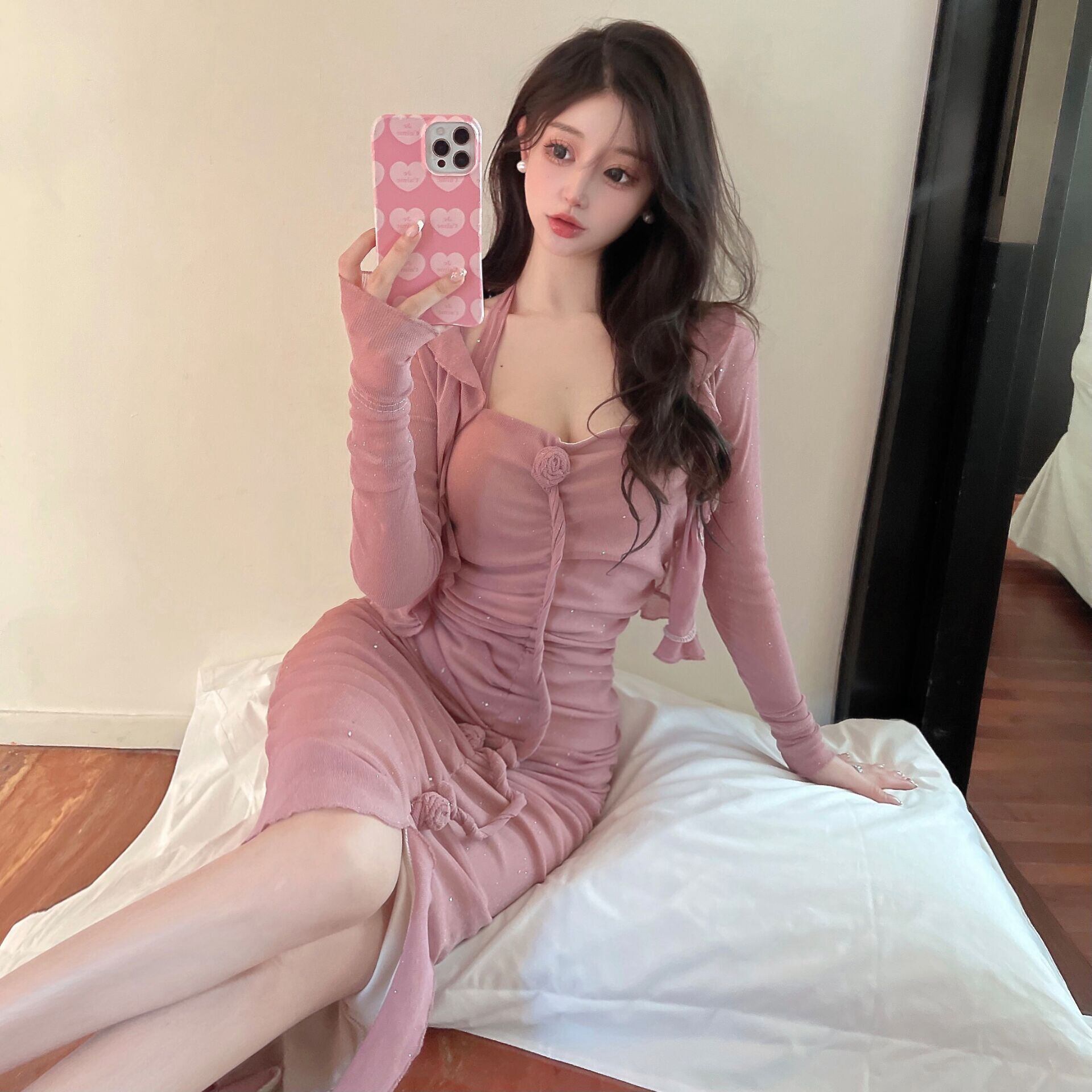 初秋の新作レディーススーツ光沢のある日焼け止めカーディガンスモールコート+セクシーなサスペンダードレスのツーピースセット micat62999388264