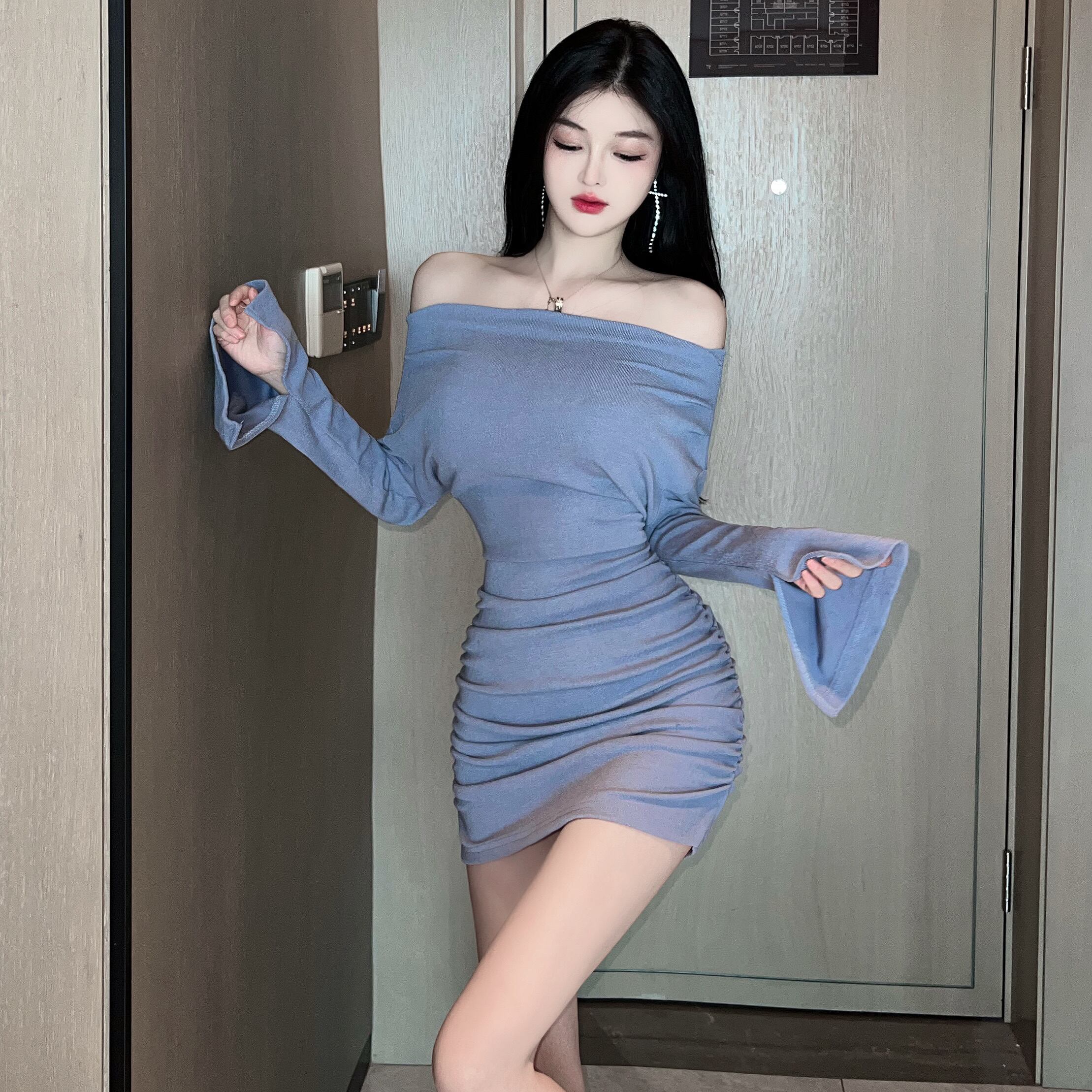 ライブ服女性アンカーポジェニックハイエンド純粋な欲望スタイル秋のセクシーなワンショルダーホーンスリーブニットドレス micat11986147535