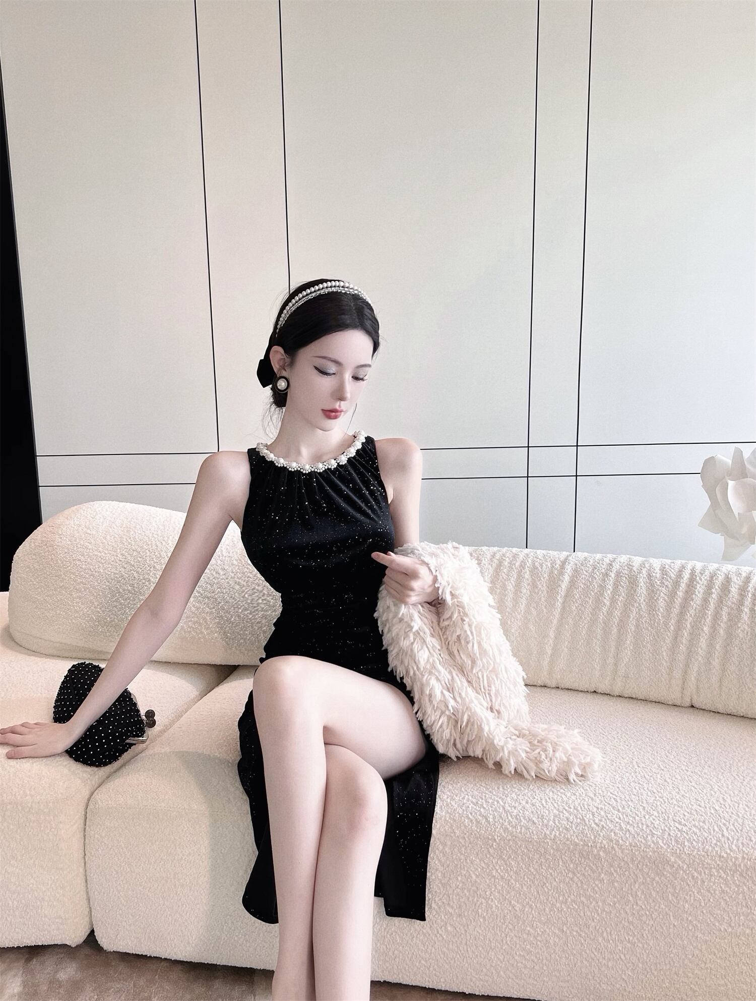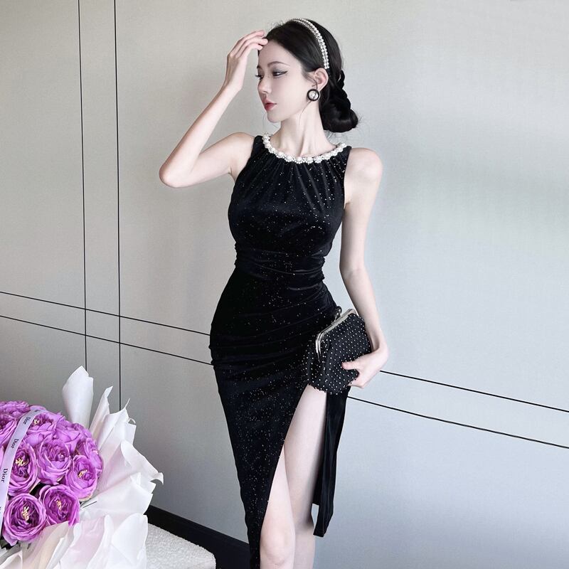 ヘップバーン スタイル イブニング ドレス スカート フェミニン気質ライト高級ニッチ ハイエンド フレンチ セクシー ブラック ゴールド ベルベット サスペンダー ドレス micat1995379257