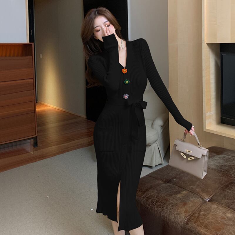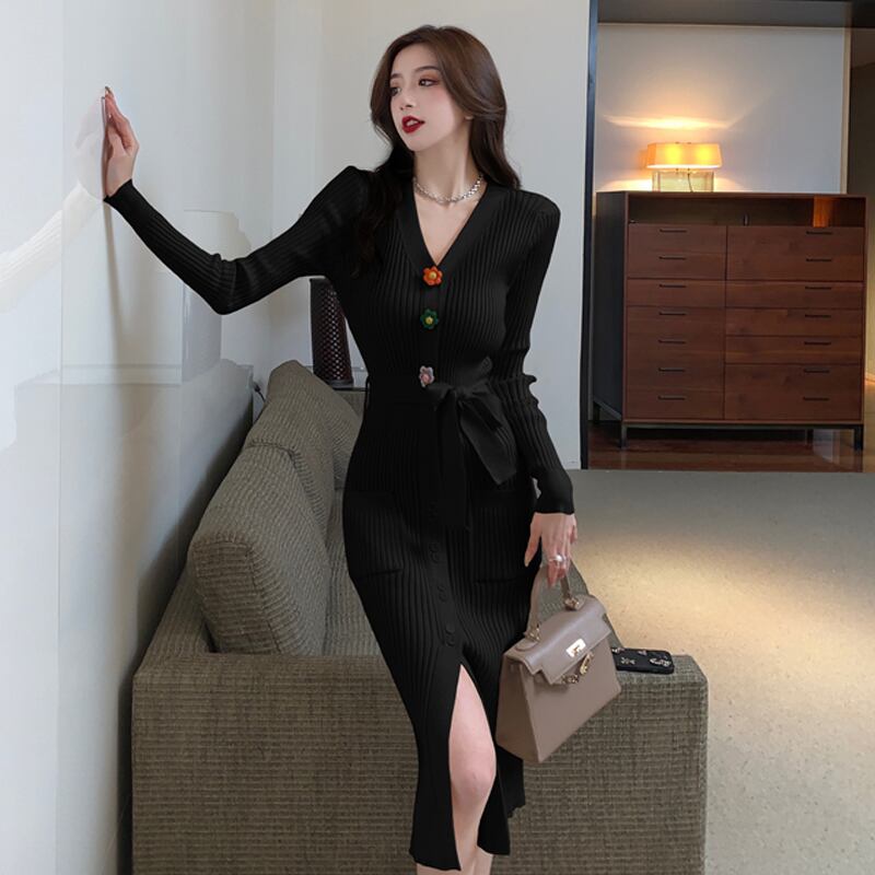 この秋、今年の人気の婦人服、新しいスタイル、軽い親近感、ロイヤルシスタースタイル、レディース気質、セクシーなVネックニット長袖ドレス micat88669544555