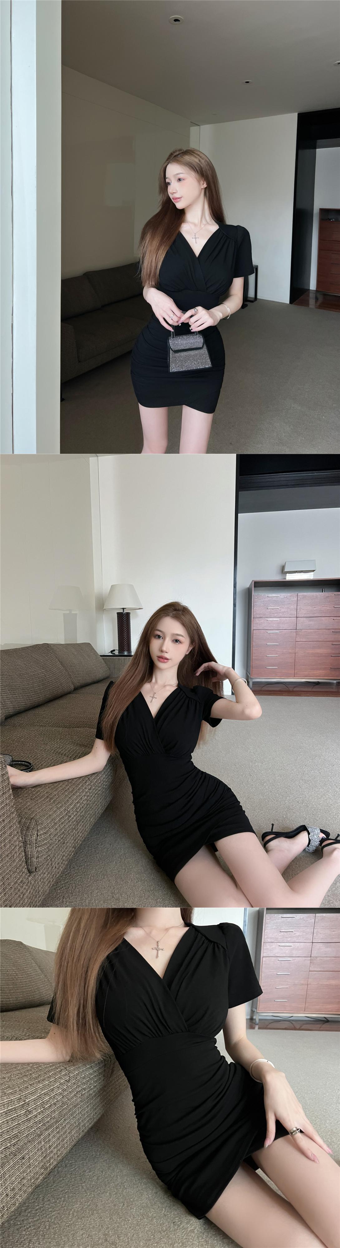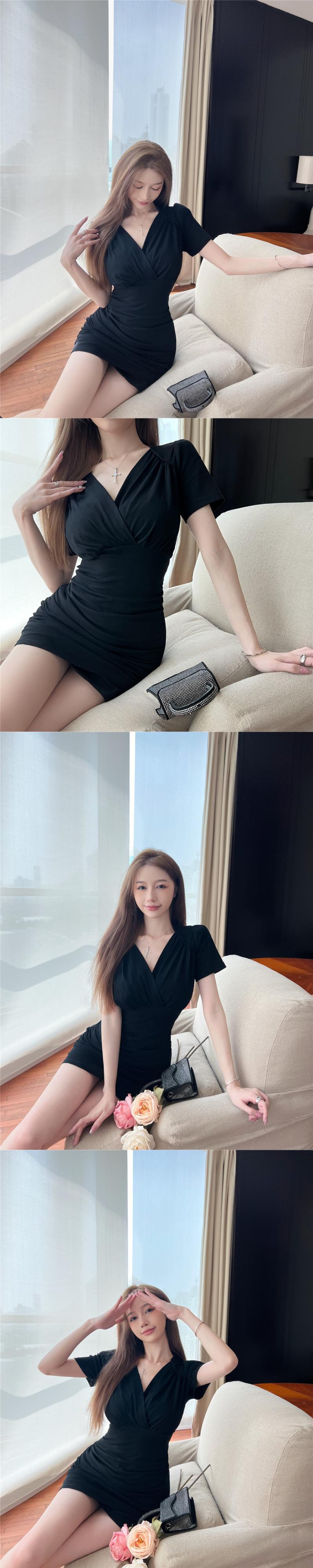 ナイトクラブの女性のナイトクラブの技術者作業服の気質のセクシーなクロス V ネック ウエスト スリムな半袖ドレス micat18838569423