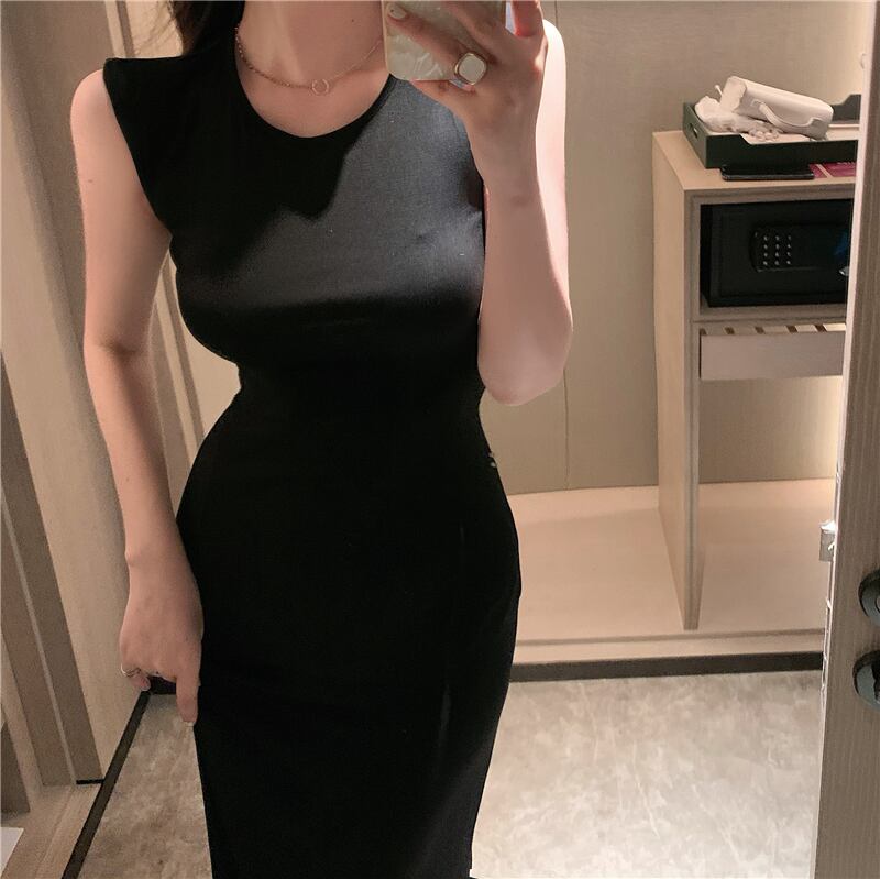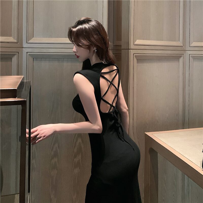 夏の女性の 2022 純赤慎重なマシン中空背中の開いたクロス ストラップ ノースリーブ ミッドレングス ドレス micat7462991582