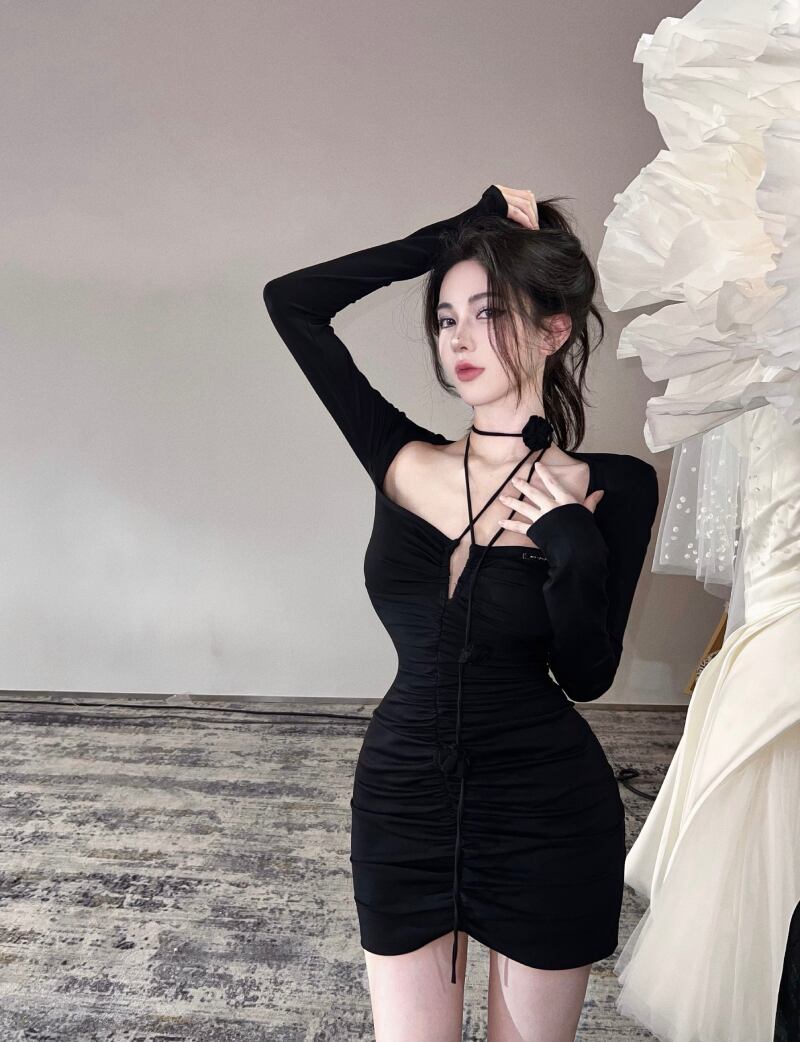 ナイトクラブの女性のバーディスコリトルブラックドレスの気質のセクシーなローカットの深いVネック長袖ヒップ吊りネックドレス micat93664431523