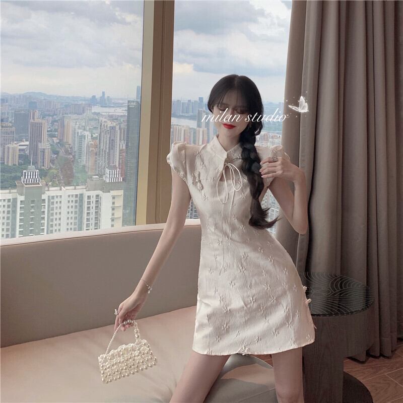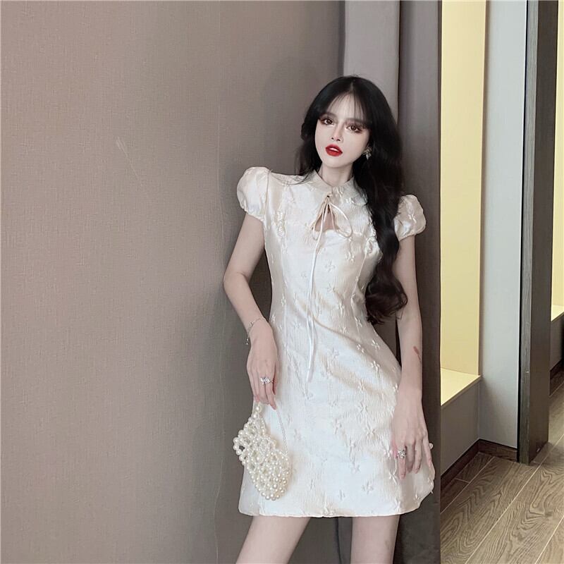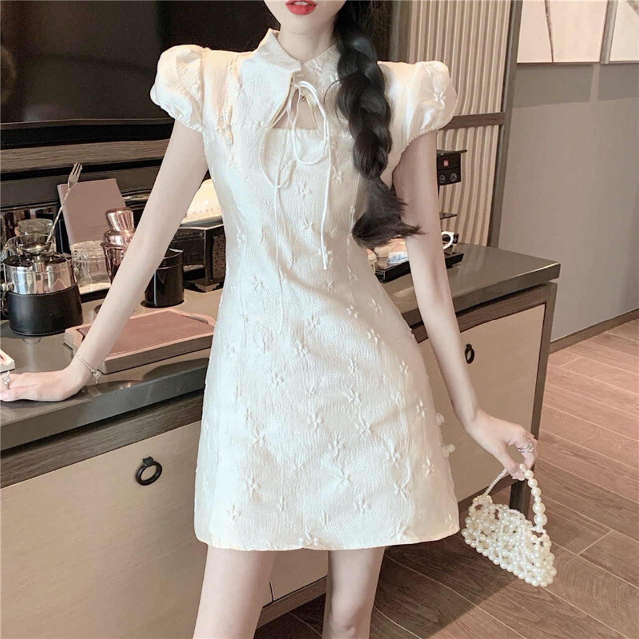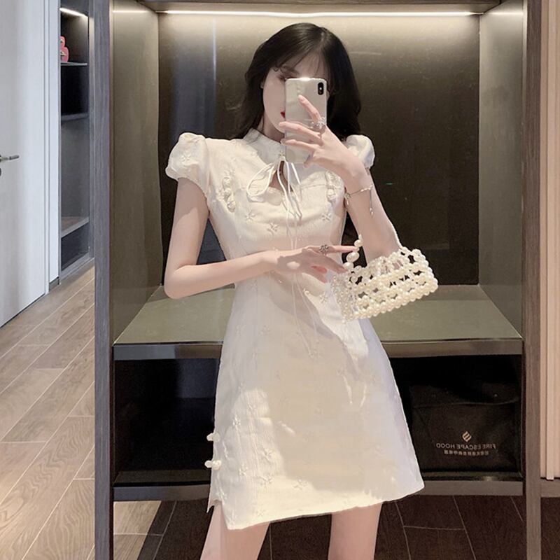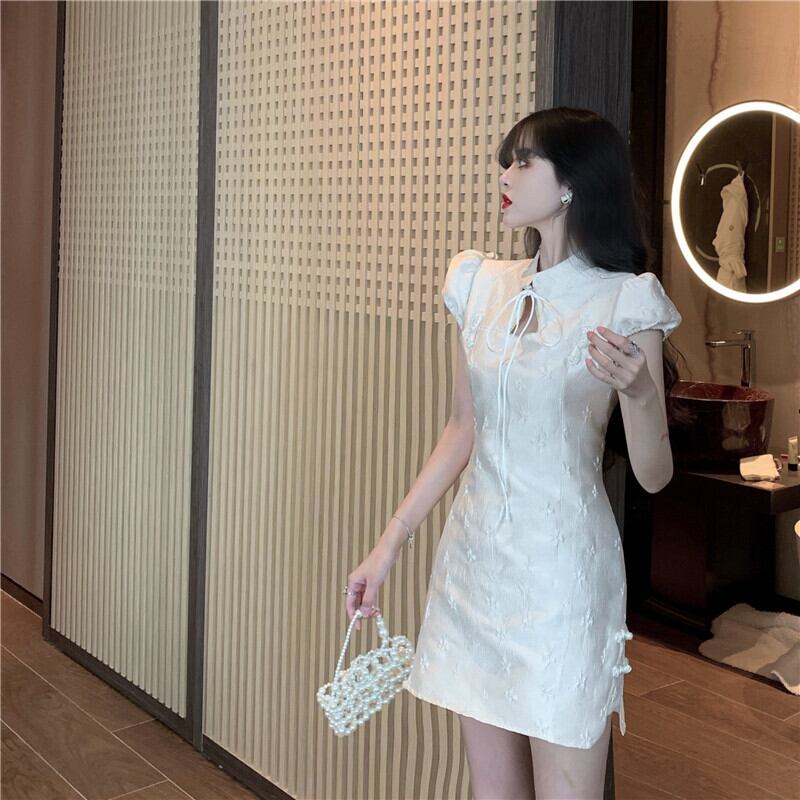 フランスの白いレースアップ改良されたチャイナ ドレス若い夏のパフ スリーブ デイリー ニッチなデザインのドレス micat33895624241