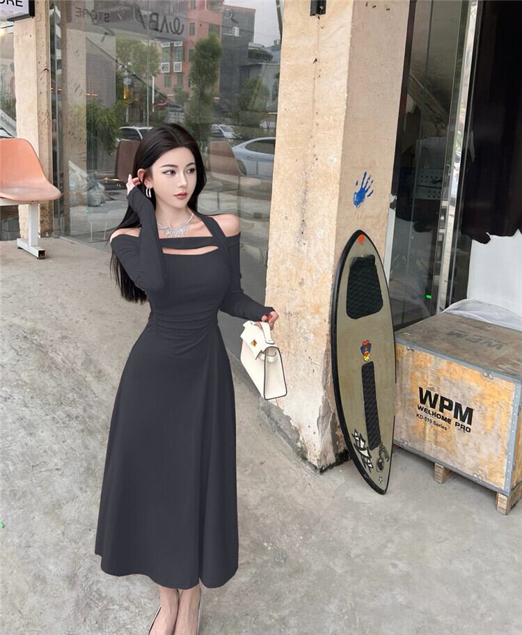 パーティーハイエンド女神スカート秋の気質セクシーなワンショルダーウエストスリムロングスカートオフショルダーホルタードレス micat85717928219