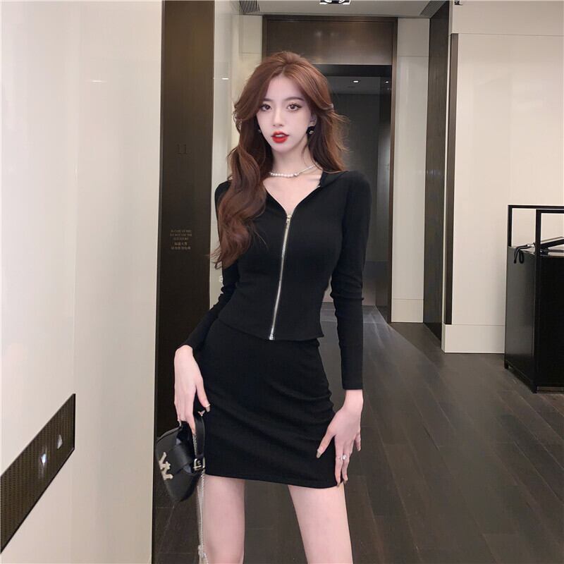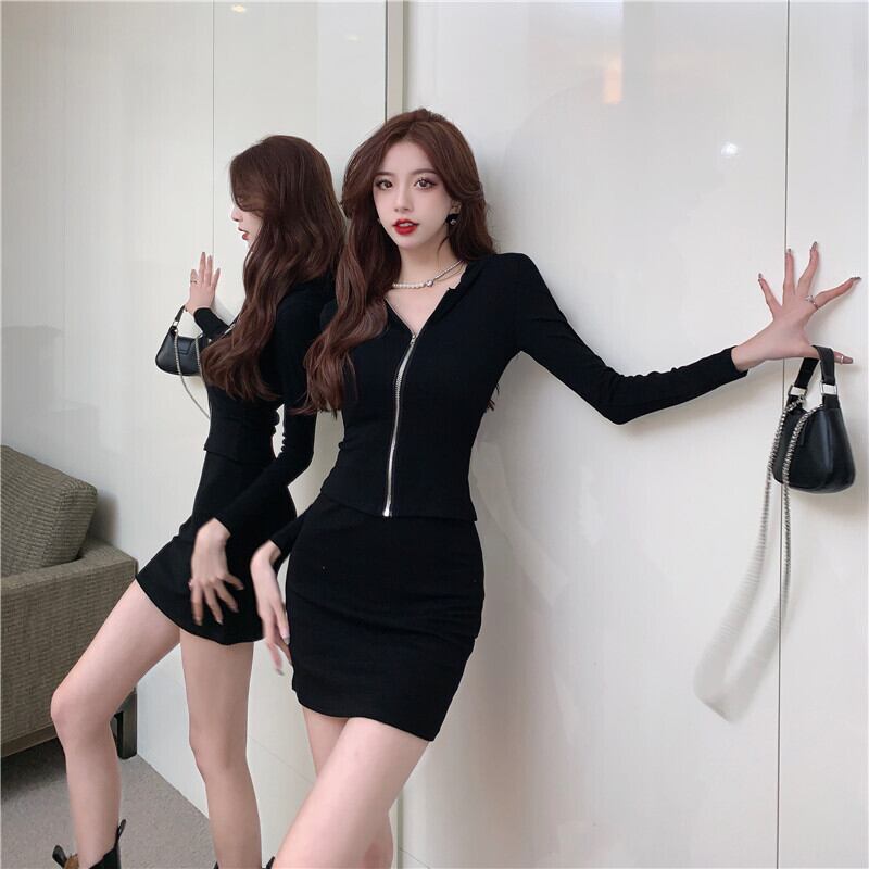 2022 秋の新レディーススーツニットジッパーカーディガンフード付きセーターハイウエストバッグヒップショートスカートツーピースセット micat36099083341