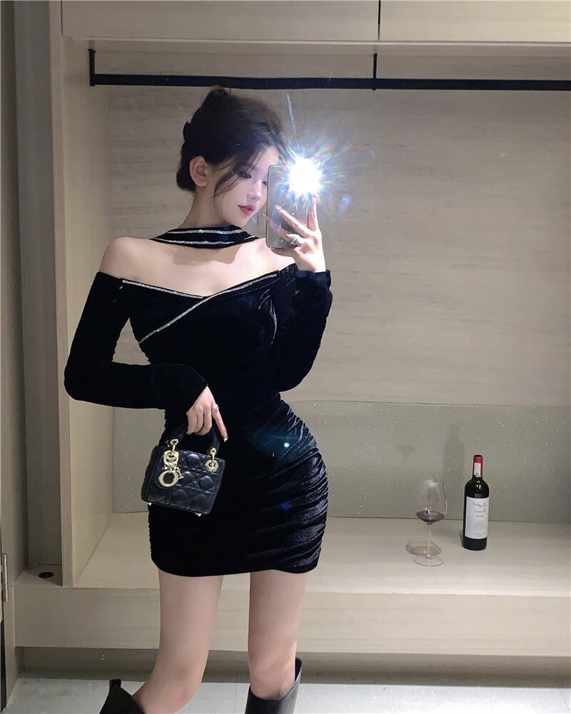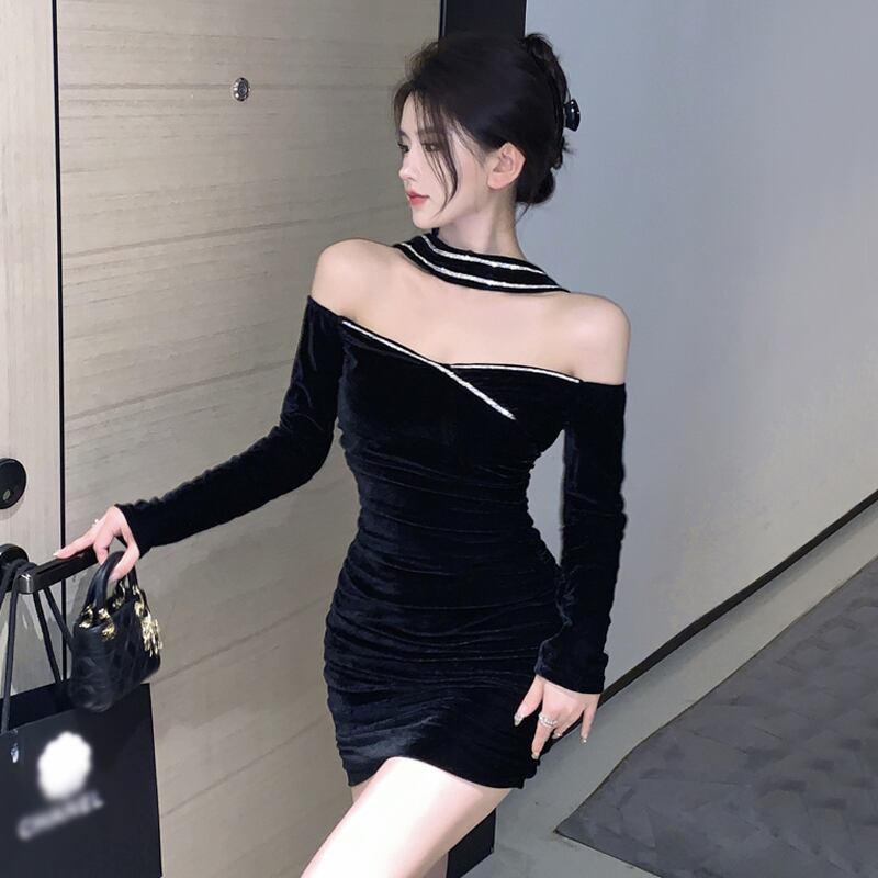 ナイトクラブのセクシーな女性の生放送のアンカーナイトショーの秋と冬のワンショルダーゴールドベルベット長袖ホルターネックオフショルダードレス micat31117075917