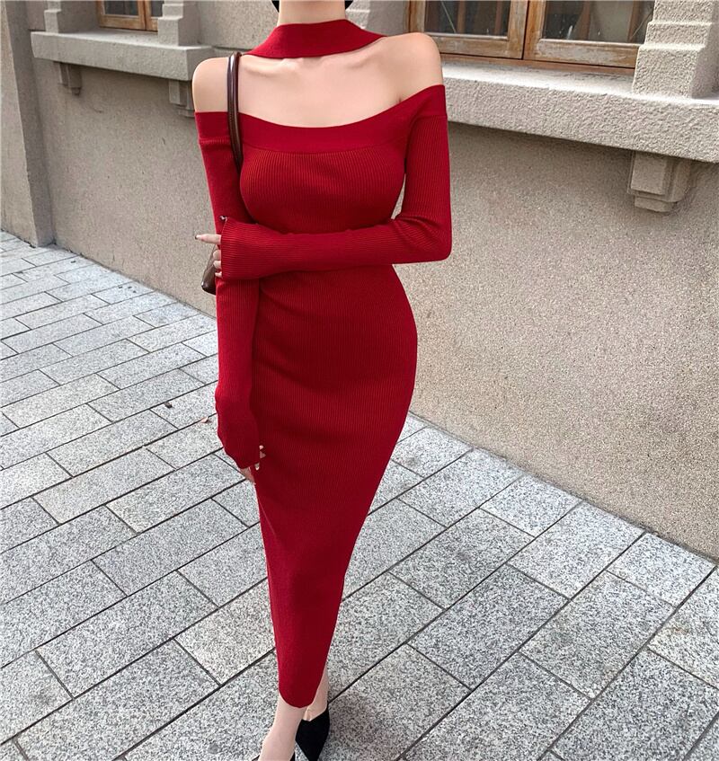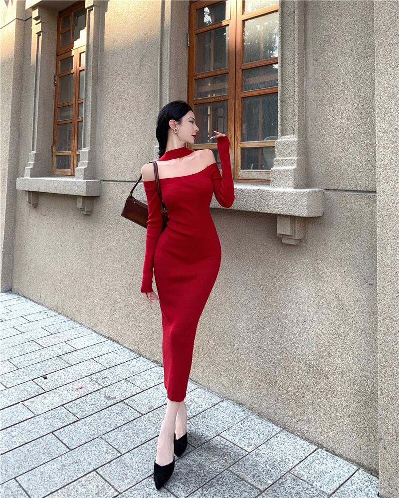 ライブ衣装 女子アナ ポジェニック シニア クリスマス レッド セクシー ワンショルダー ニット オフショルダー ホルターネック ドレス micat6048377993