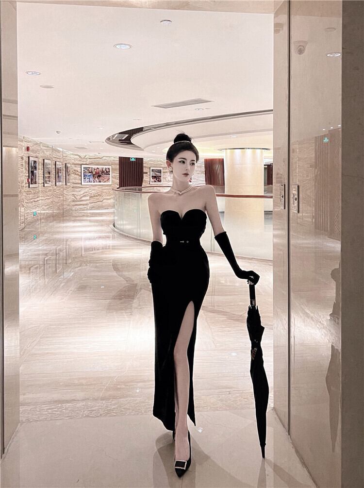 ヘップバーン スタイル黒イブニング ドレス ハイエンド ライト高級ニッチ女性宴会気質セクシーなチューブ トップ ベルベット ドレス micat34098794948