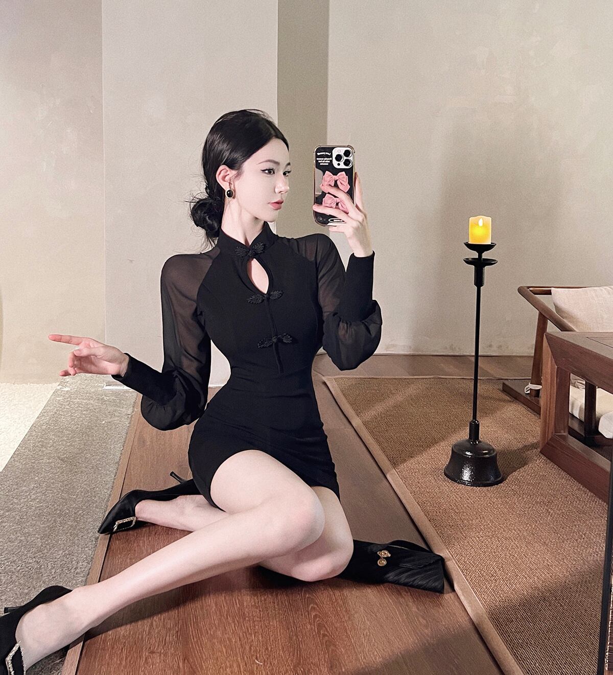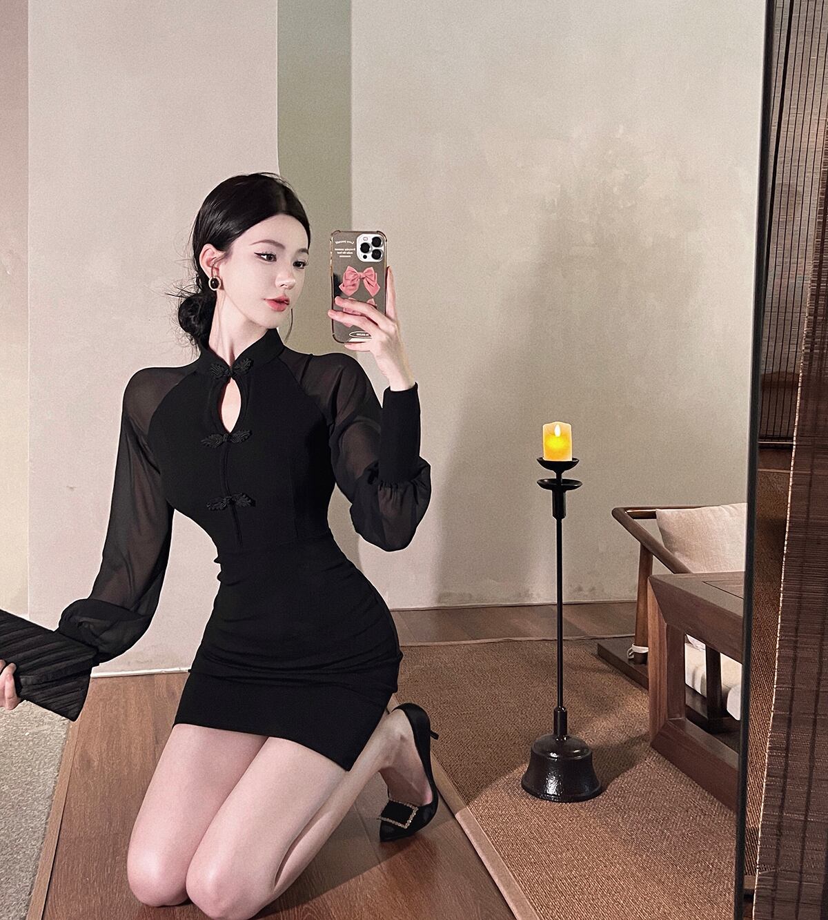 ライブ服女性アンカー ハイエンド黒若いセクシーなメッシュ ステッチ改良されたチャイナ ドレス micat61800197768