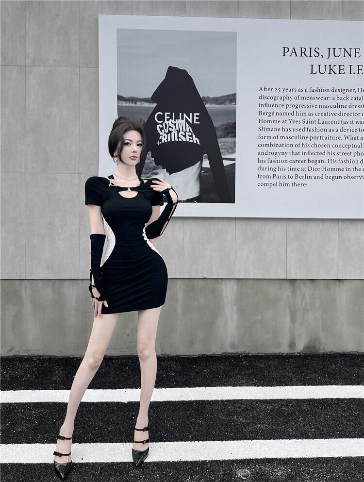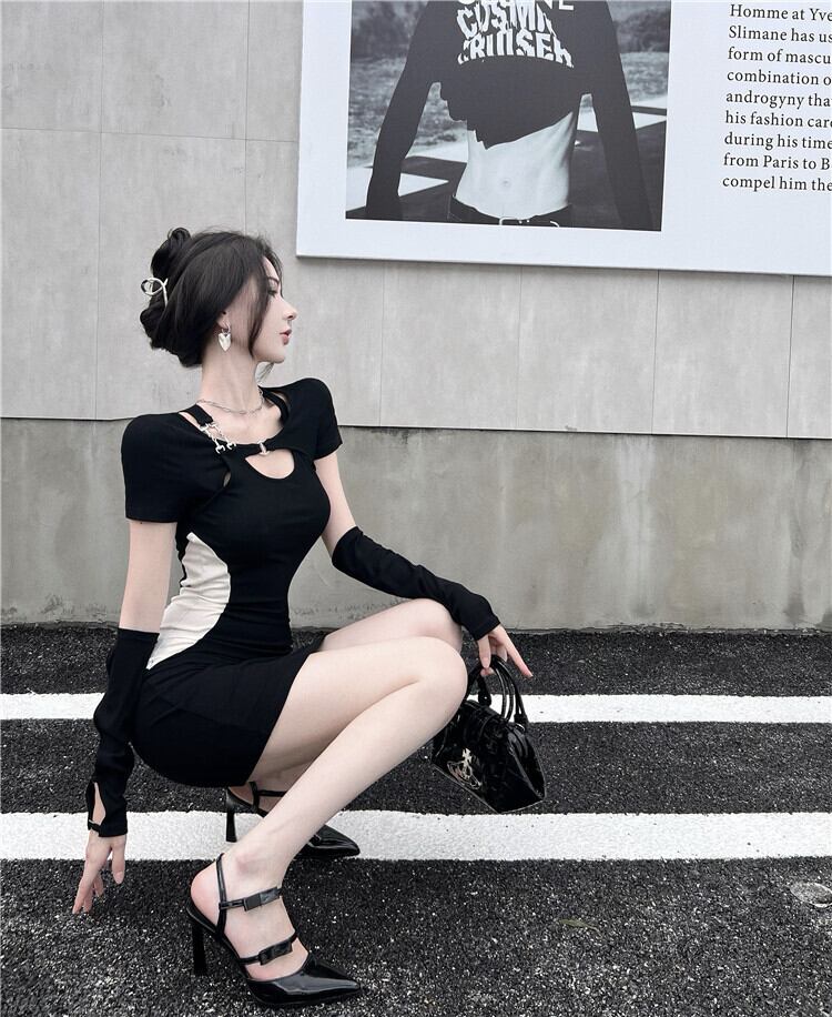 涼し気なレディースダークスタイル初秋今年人気のセクシーヒップパックlワンピース+中空長袖 micat63419374085