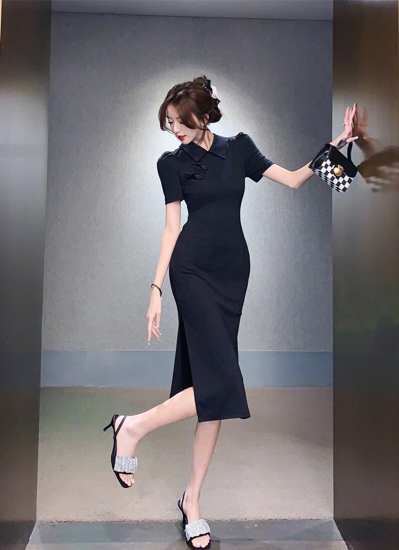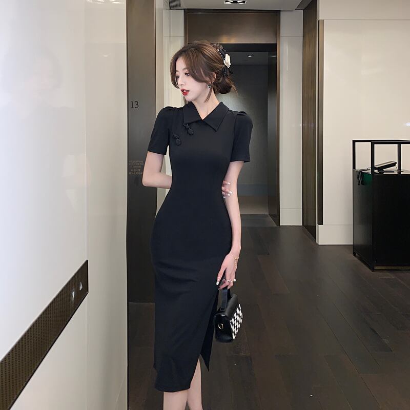 黒のチャイナ ドレス女性の夏の若い改良版ファッション ポロ襟日常スリム ミッドレングス ドレス micat71576564305