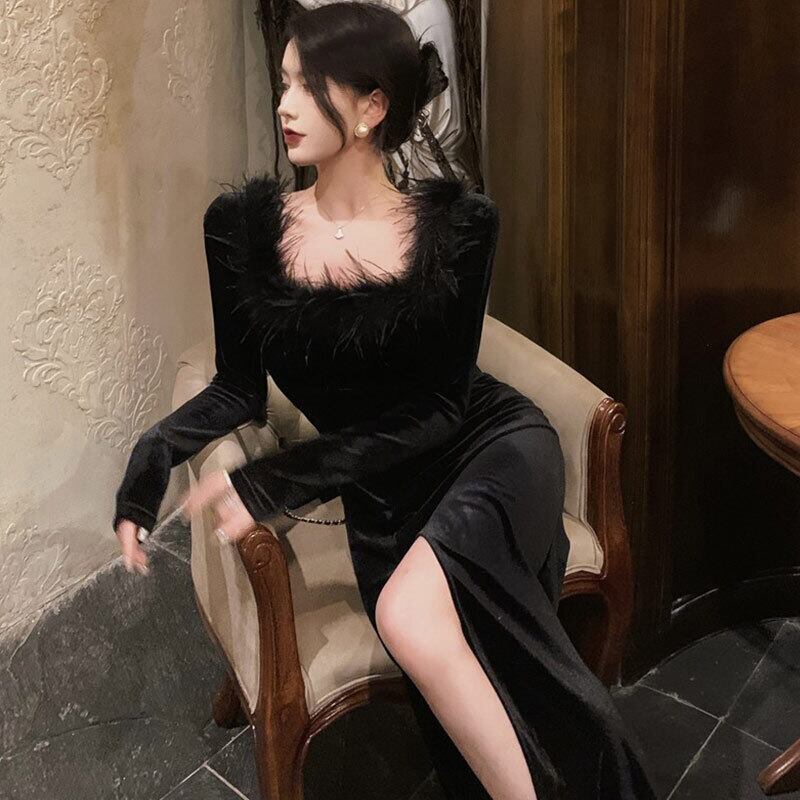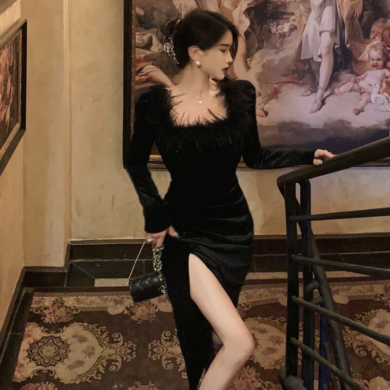 ヘップバーンスタイルのハイエンドイブニングドレスハイエンドライトラグジュアリーニッチ女性の秋と冬の気質の女性フレンチゴールドベルベットドレス micat25061256987