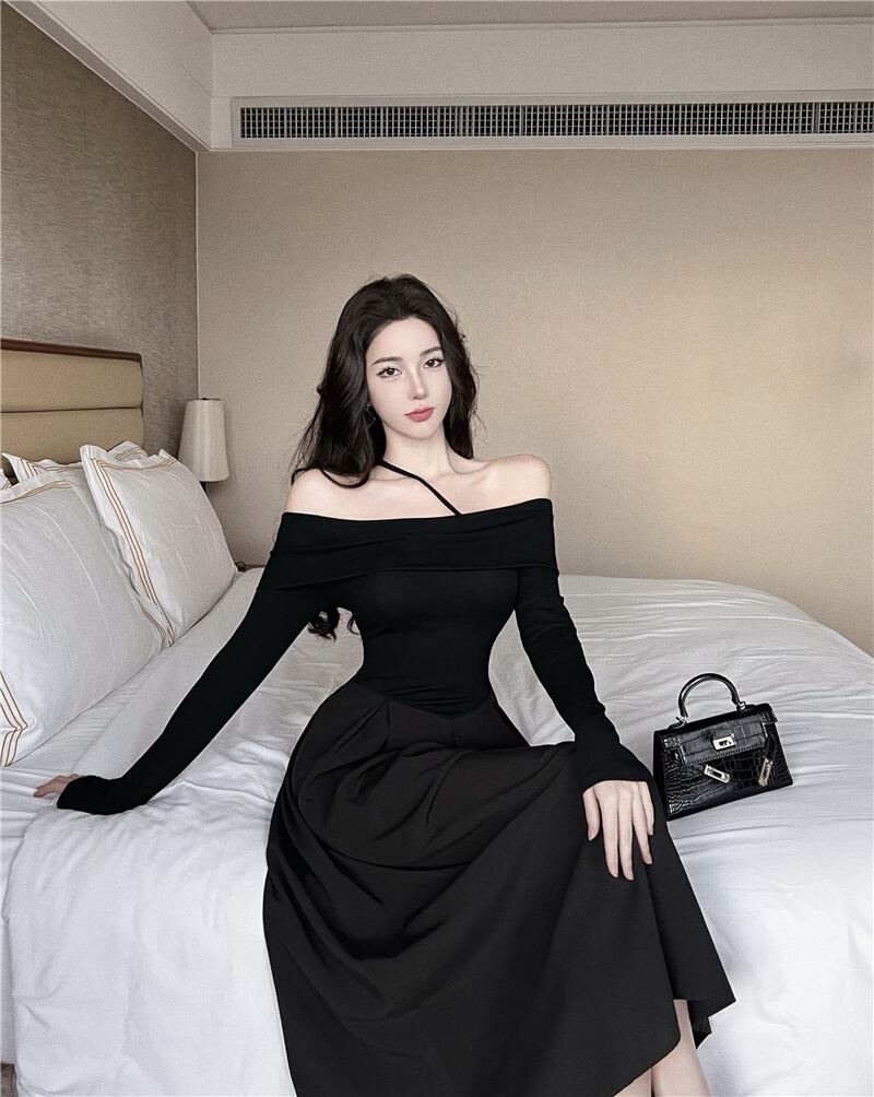 ヘップバーン スタイル イブニング ドレス ロング スカート女性の軽い高級ニッチ ハイエンド黒気質セクシーなワンショルダー長袖ドレス micat85385036484