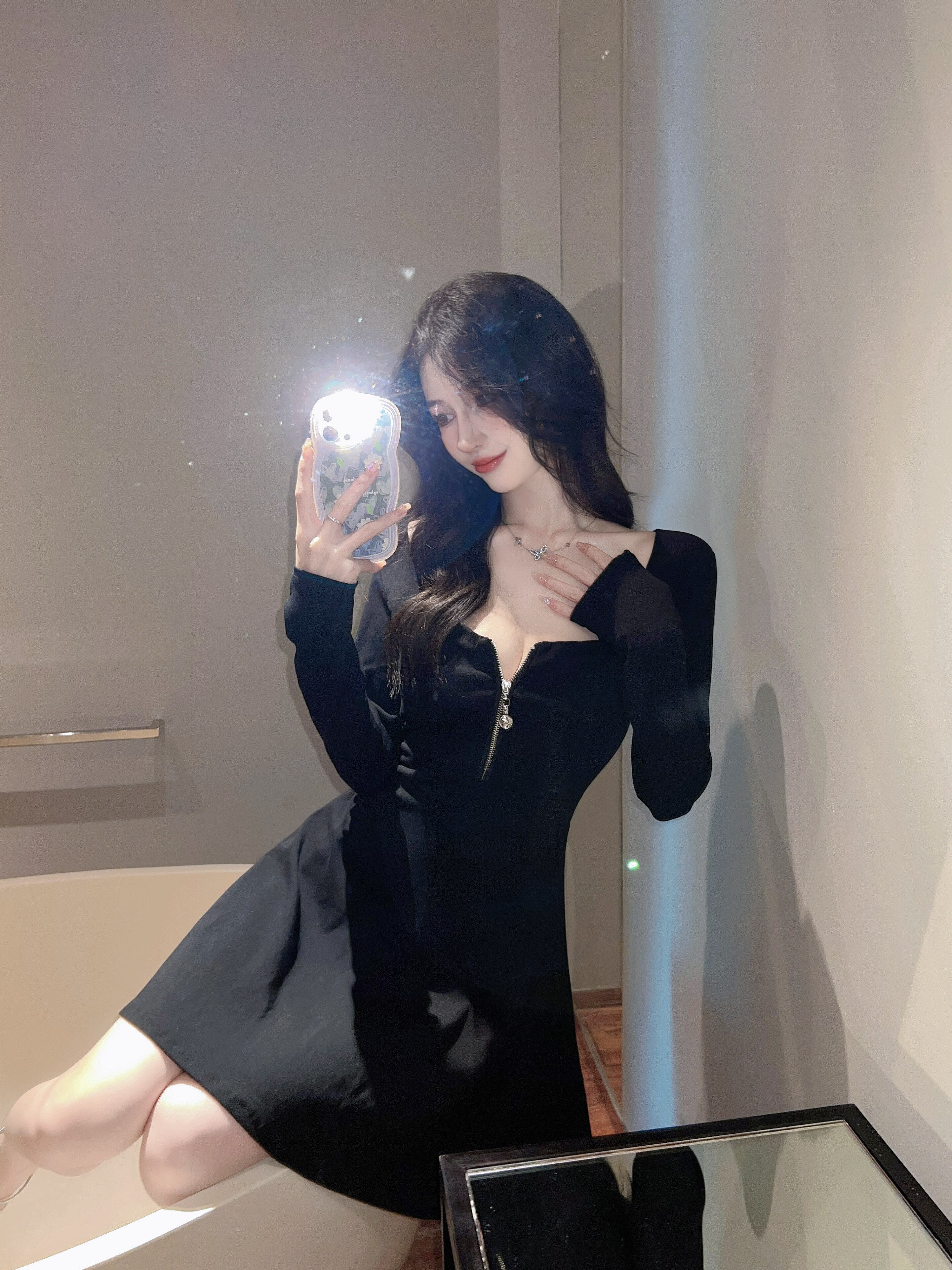 ナイトクラブ セクシー レディース 秋冬 夜間作業服 作務衣 ローカット ジッパー スクエアカラー スリム 長袖ワンピース micat75522930952