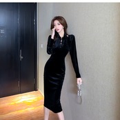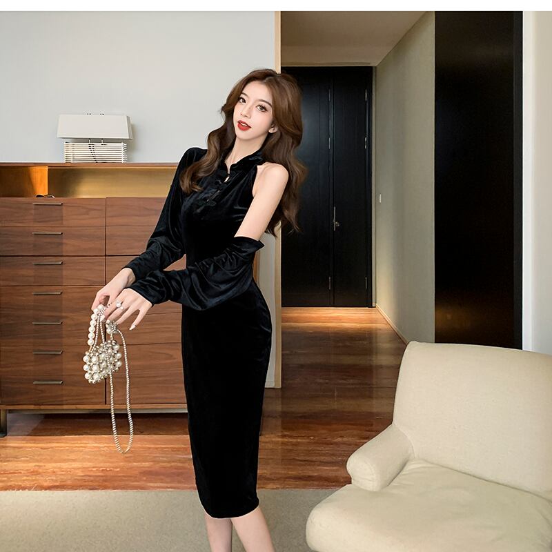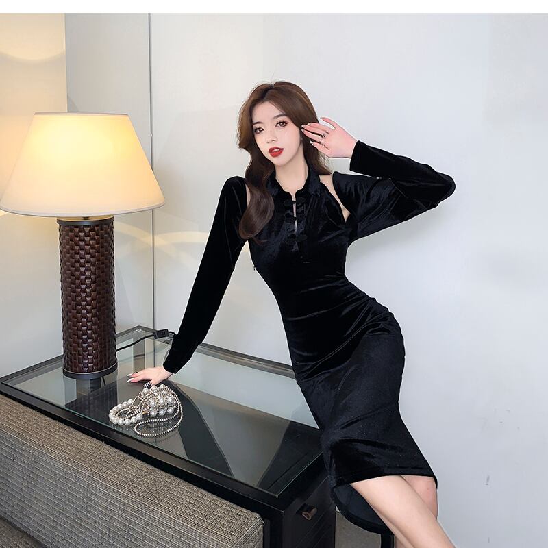 チャイナ ドレス 2022 秋 スーツ ゴールド ベルベット ロング スリーブ ショール + セクシーなノースリーブ ミッドレングス ドレス micat82295203922