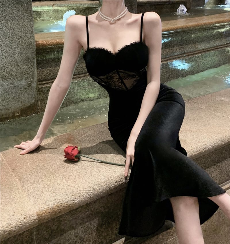 ヘップバーン スタイル イブニング ドレス ドレス ハイエンド ライト ラグジュアリー ニッチ レディース 気質 セクシー レース ゴールド ベルベット サスペンダー ドレス micat20413773787