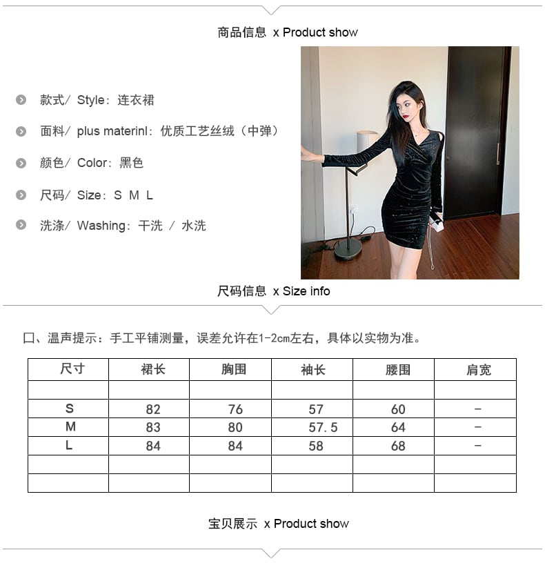 ナイトクラブのセクシーな婦人服の秋と冬の夜のシーンの気質クロス V ネックの光沢のある長袖のヒップパック ゴールド ベルベットのドレス micat60061275965
