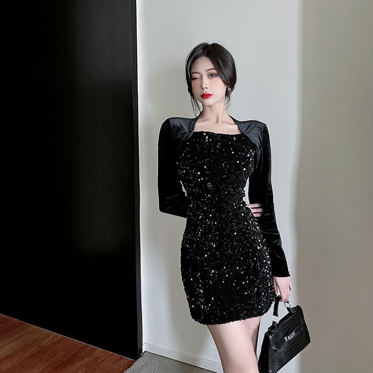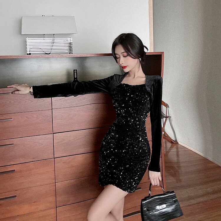 ナイトクラブのセクシーな女性の秋と冬のナイトバージャンプ黒スパンコールスクエアカラー長袖ヒップベルベットドレス micat52455975298