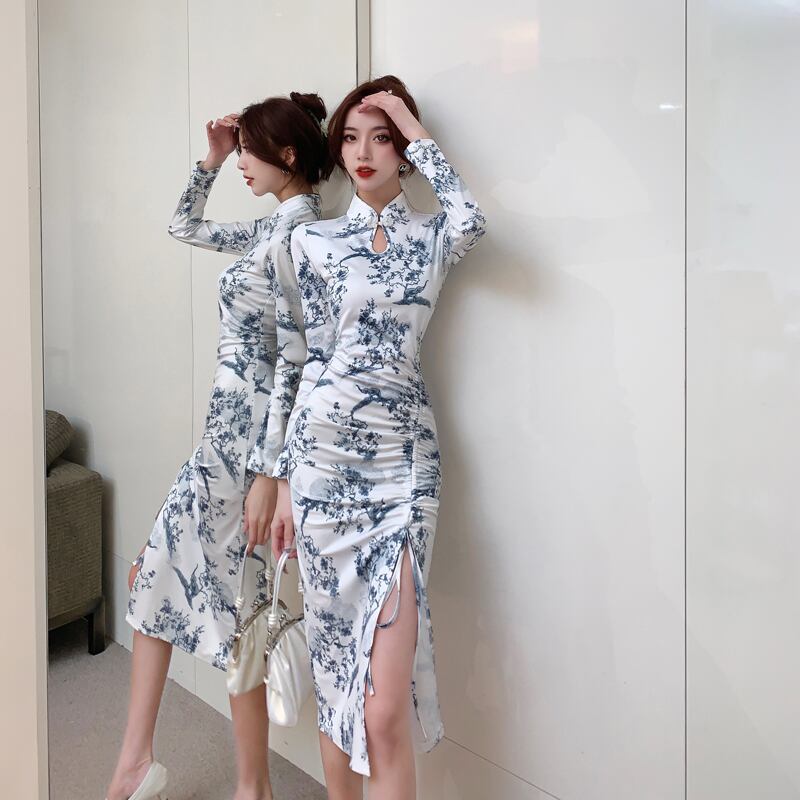 夜の上海のチャイナドレスのイブニングドレスの女性の秋のトーストのドレスは、若いセクシーな長袖のミドル丈のドレスを改善しました micat32520870328