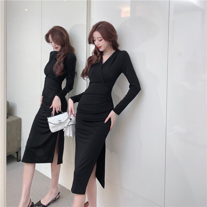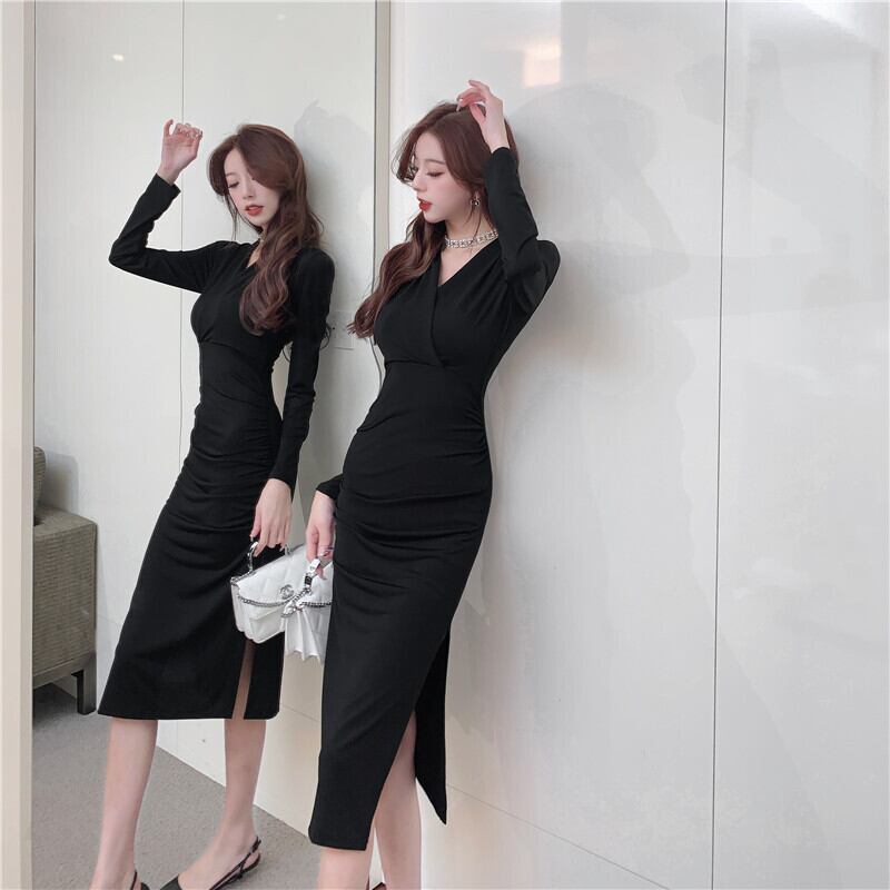 秋の気質の女神Fan Qingshu YujieスタイルのセクシーなクロスVネックの長袖の黒のスリムなミッドレングスのドレス micat37354025323