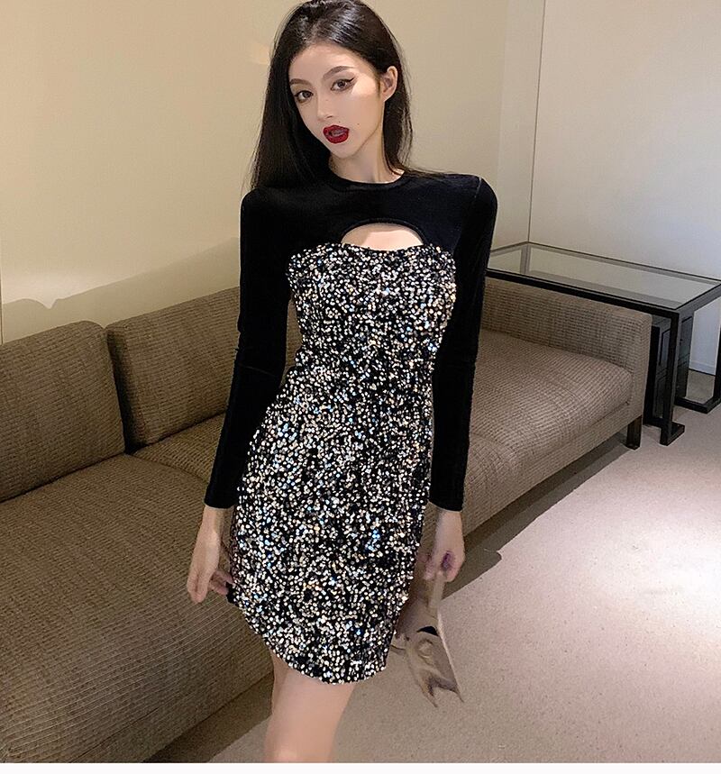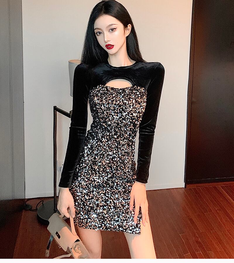 ナイトクラブのセクシーな女性の秋と冬のモデル夜のフィールド中空輝くスパンコール ステッチ ゴールド ベルベット長袖ヒップ ドレス micat58321107635