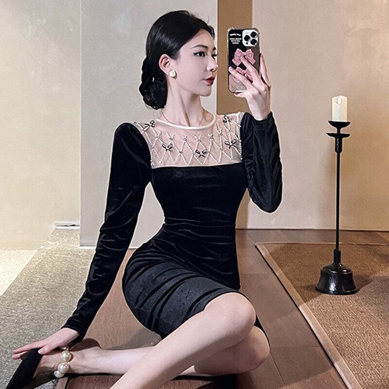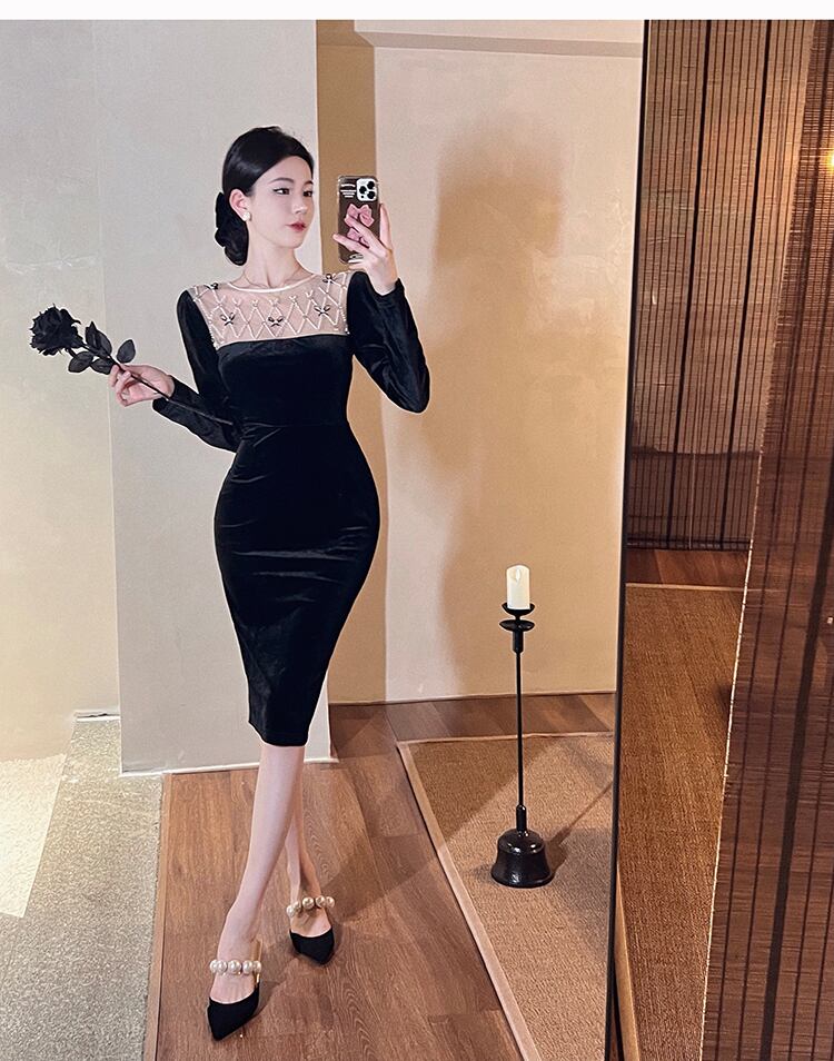 ヘップバーン スタイル イブニング ドレス スカート フェミニン気質ライト高級ニッチ ハイエンド フレンチ セクシーな黒の長袖ゴールド ベルベット ドレス micat18607786377