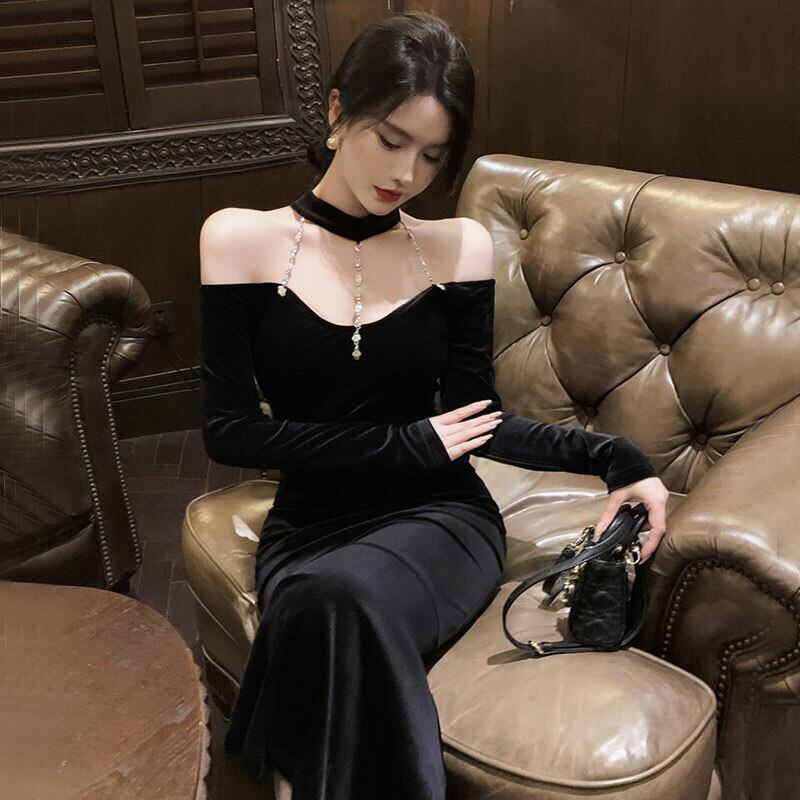 ヘップバーン スタイル黒イブニング ドレス ハイエンド ライト高級ニッチ レディース気質セクシーなゴールド ベルベット ストラップレス ホルター ドレス micat95391078103