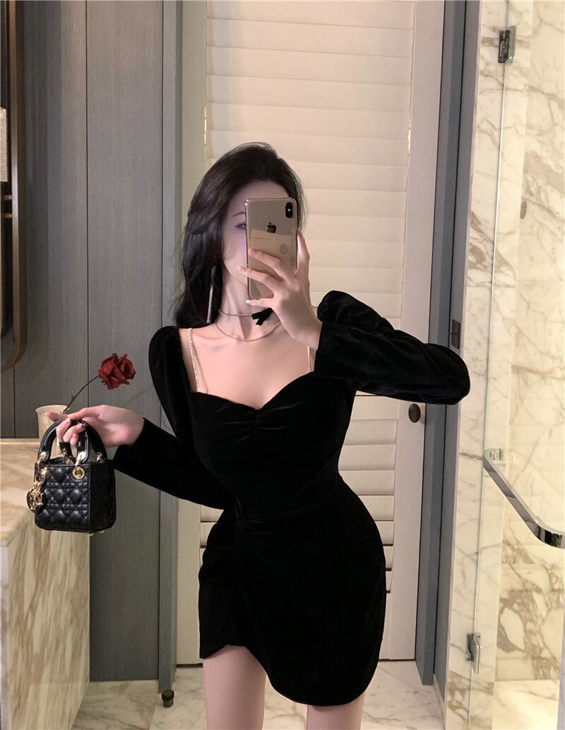 ヘップバーン スタイル イブニング ドレス ライト高級ニッチ女性秋と冬のハイエンド気質の女性のセクシーなショート ゴールド ベルベット ドレス micat56988543938