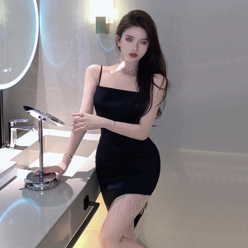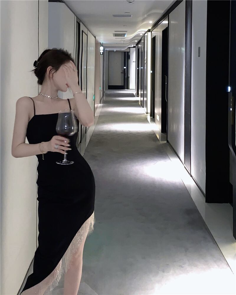 ヘップバーン風イブニングドレス ライトおなじみのハイエンドニッチ気質レディースブラックセクシーテルスプリットサスペンダードレス micat30153082952