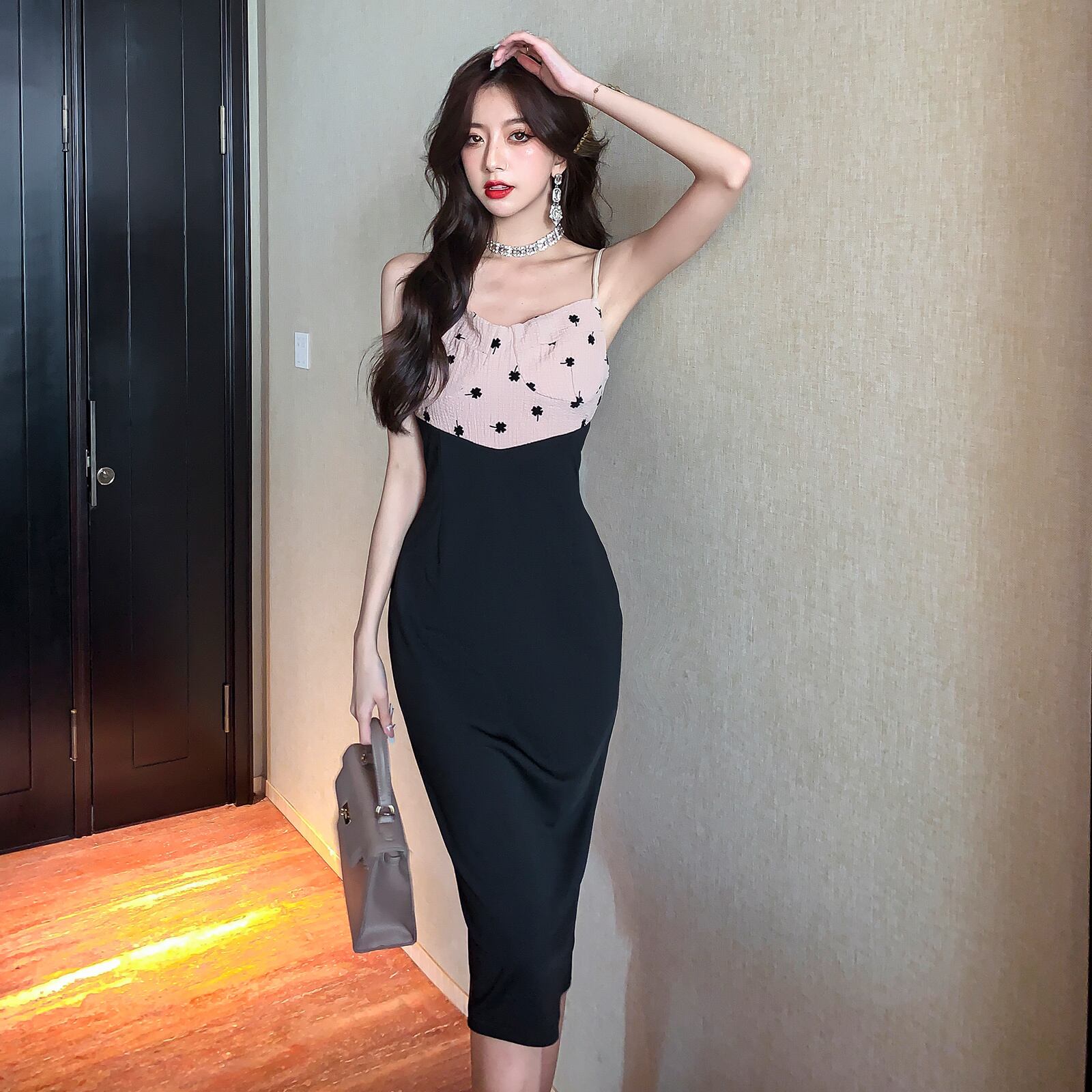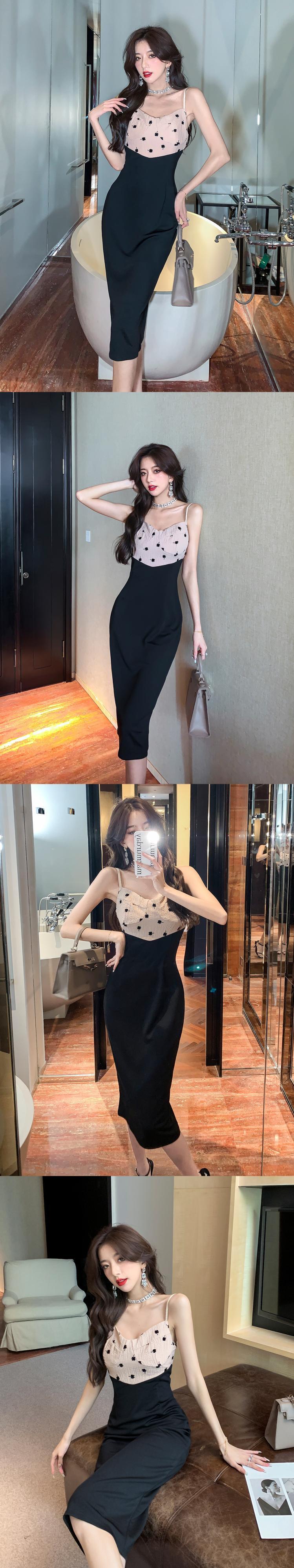 フランスのシックな見事なドレス女性の夏のレトロな花柄ステッチ スリム フィットとスリムなミッドレングスのサスペンダー ドレス micat59263765769