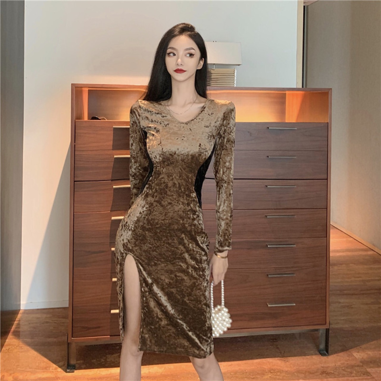 秋と冬の女性の女性の気質のレトロなステッチの金のベルベットのセクシーなミッドレングスのスリットの長袖のドレス micat86278696191