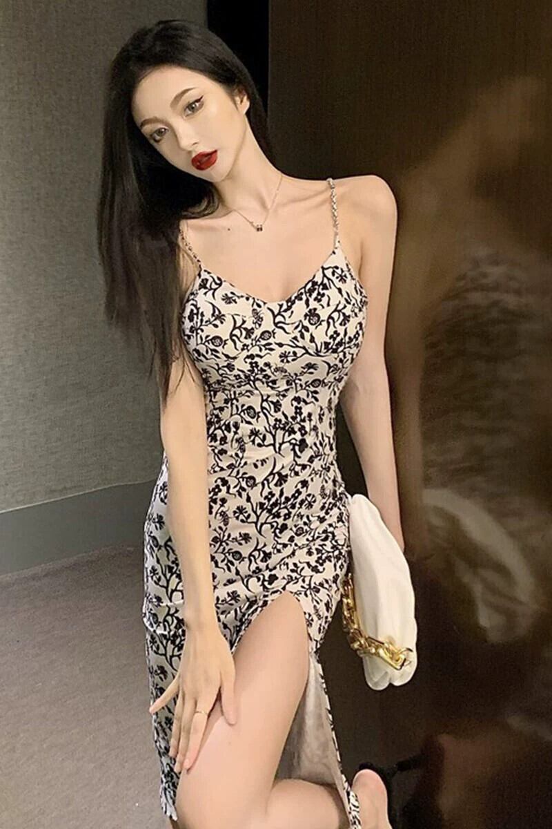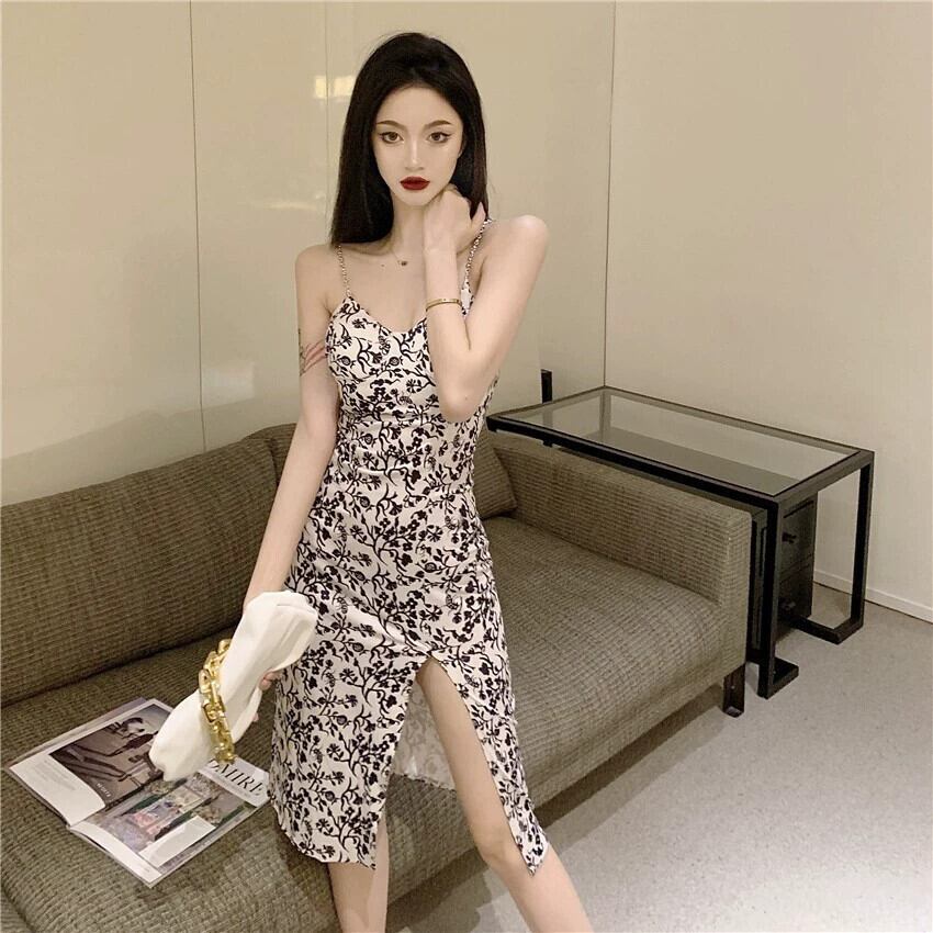 夏の婦人服 2023 新しいセレブ気質セクシーな V ネックレトロプリントスリットチェーンスリングドレス サマー 夏物 Vネック yeyij95590450455