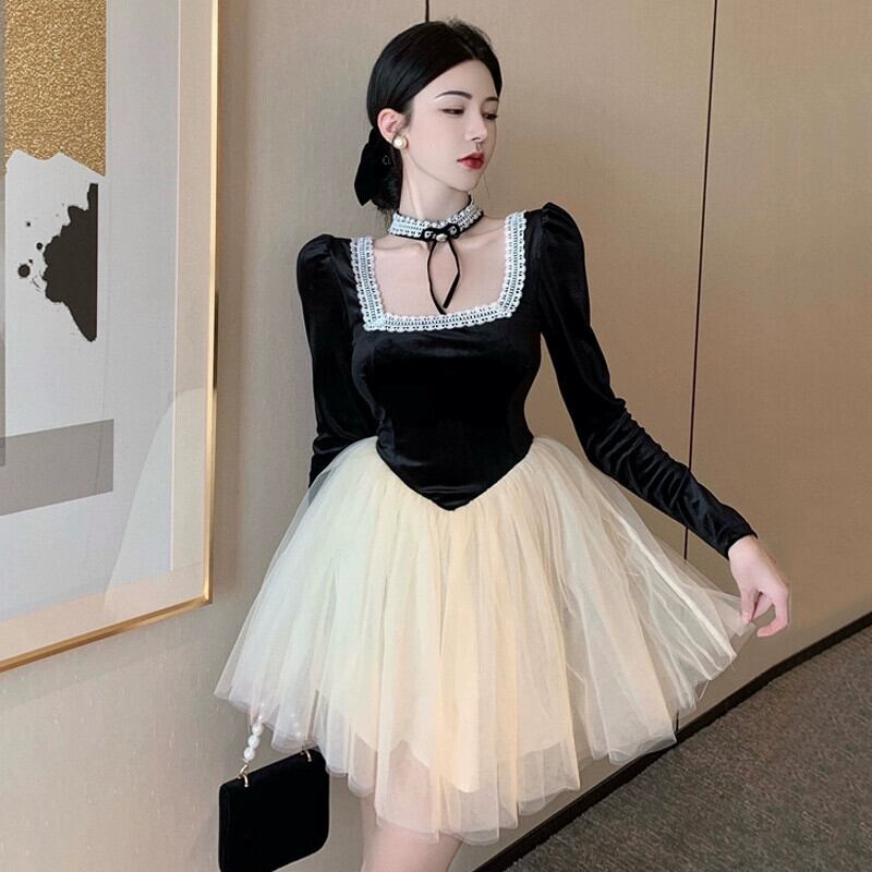 ヘップバーンスタイルフランスの気質誕生日イブニングドレスライト高級ハイエンドニッチブラックチュチュスカートゴールドベルベットドレス パニエ ペチコート yeyij57046726574