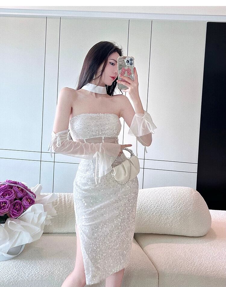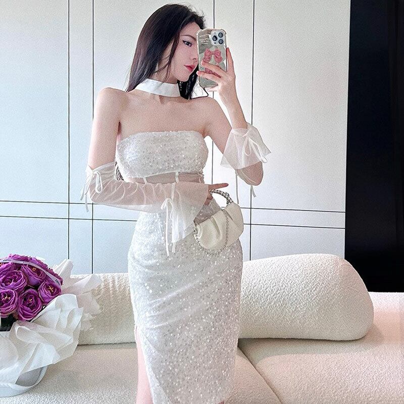 ホワイトイブニングドレススカートフェミニニティライトラグジュアリーニッチハイエンドフレンチスパンコールメッシュセクシーな見事なチューブトップドレス yeyij74206033307