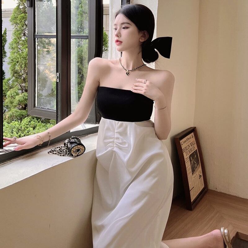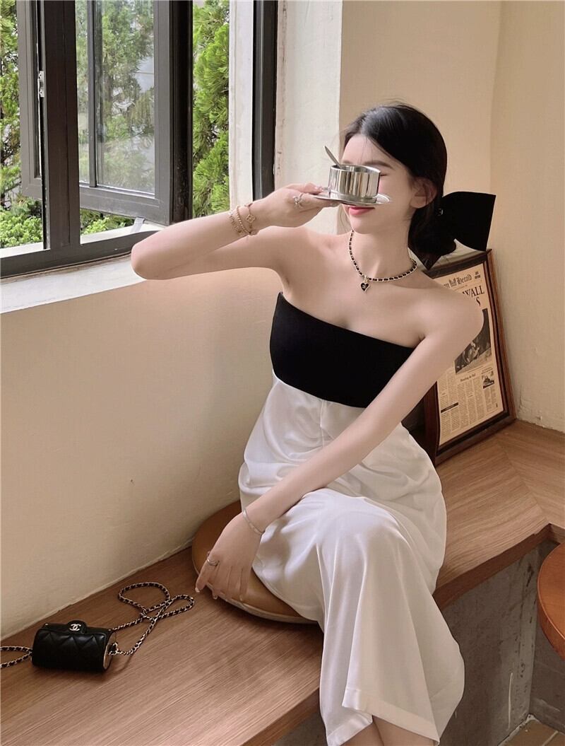 ヘップバーンスタイルのイブニングドレスの女性のハイエンドライト高級ニッチフレンチハイエンド黒と白のセクシーなワンショルダーチューブトップドレス ホワイト ブラック yeyij53792897836